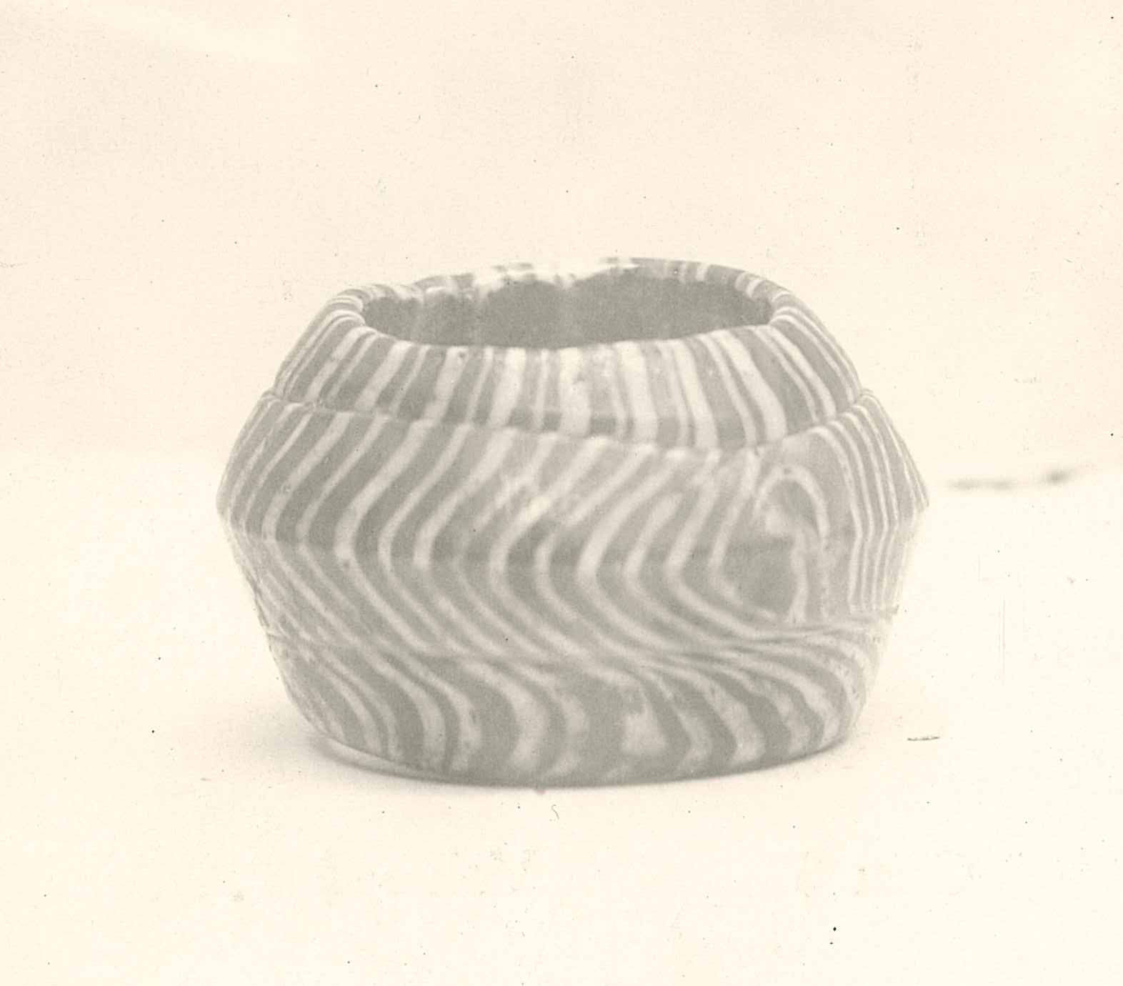 DescriptionDark blue ground; white decoration; ring shaped (spindle shaped profile); white threads applied diagonally and marvered; divided into three horizontal lobes (cane was probably wound around core three times).