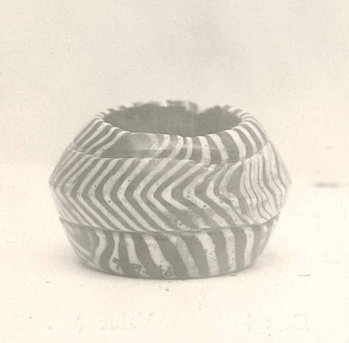 DescriptionDark blue ground; white decoration; ring shaped (spindle shaped profile); white threads applied diagonally and marvered; divided into three horizontal lobes (cane was probably wound around core three times).