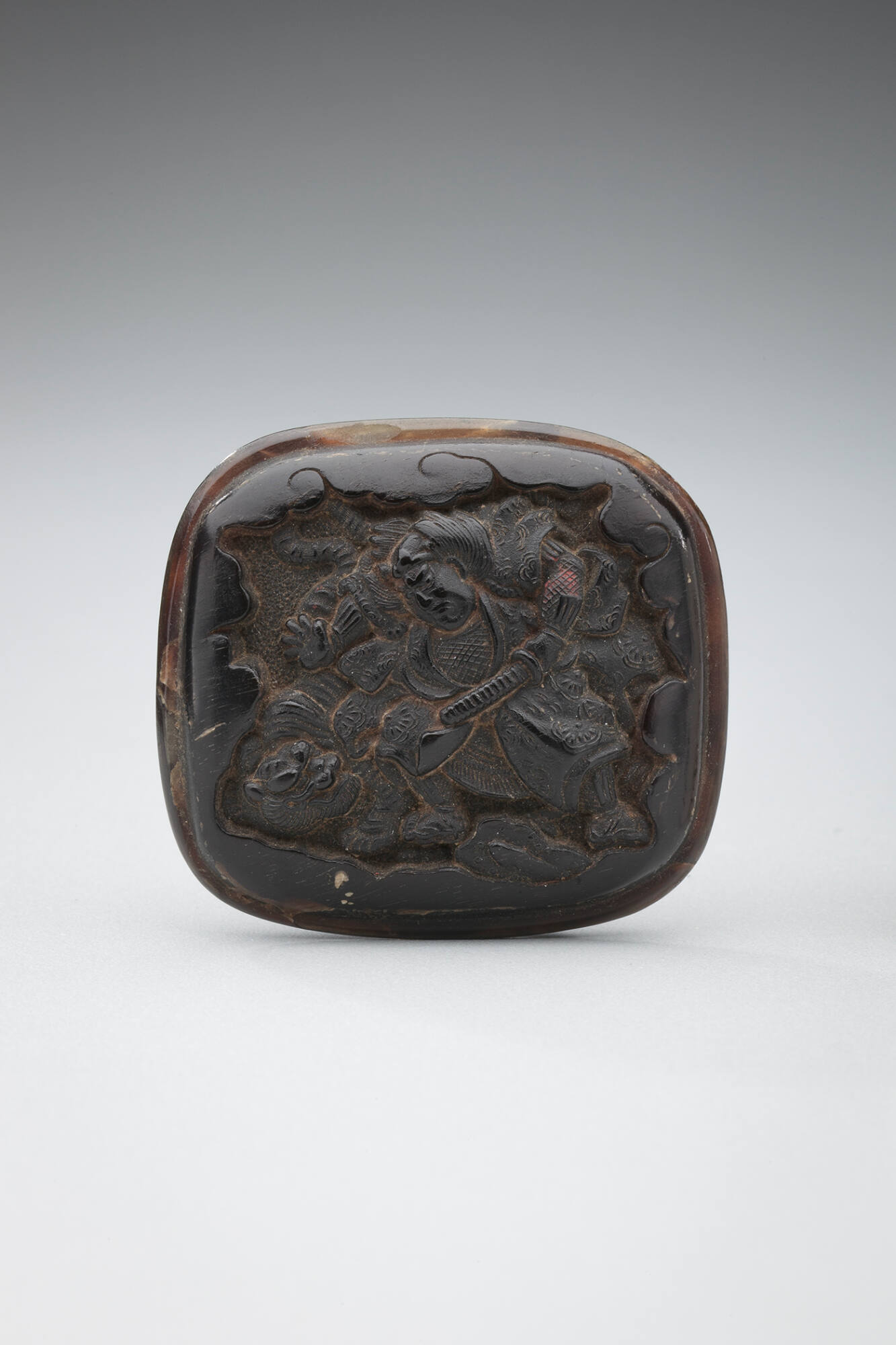 DescriptionSquare, button type; tortoise shell; wood, carved and coated with red lacquer, imitating the tsui-shu technique.