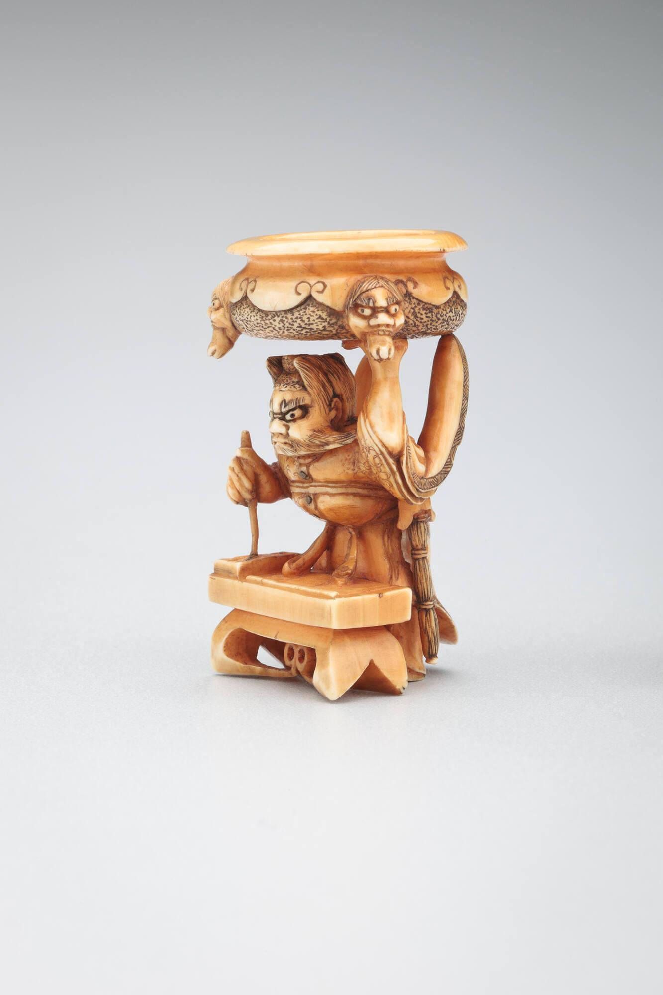 Netsuke: Goshisho holding bronze cauldron while writing a poem