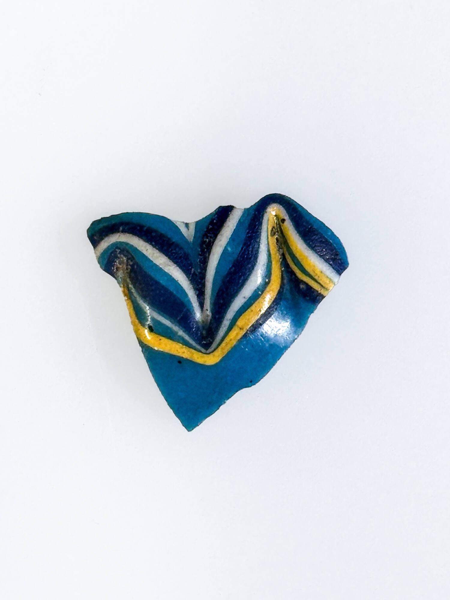 DescriptionFragment of side of vessel. Opaque turquoise-blue ground with opaque white, opaque yellow, and opaque dark blue decoration. Convex curving side. Applied marvered threads tooled into a festoon pattern. Short, vertical indentations on the body caused by the tooling of the festoons.