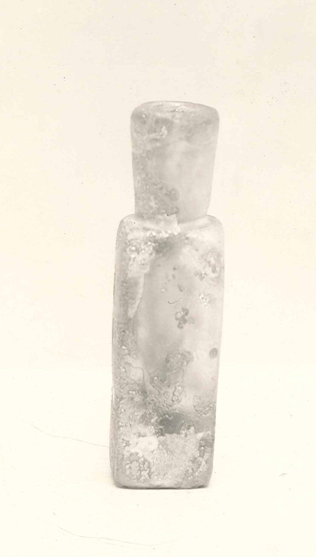 DescriptionColorless; thick rim; neck tapers toward shoulder; angular shoulder; rectangular body; small interior space.