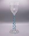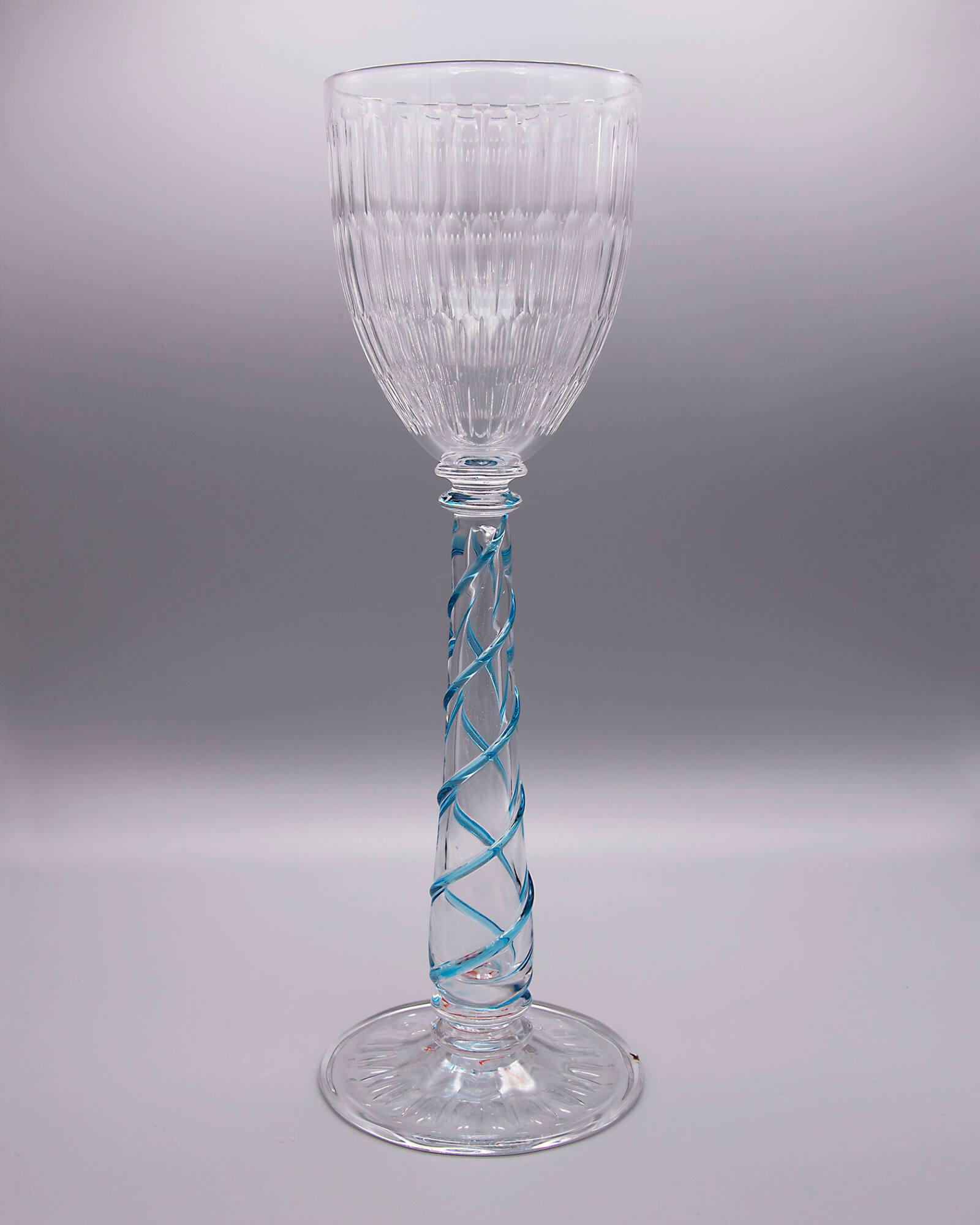 DescriptionKhedive, K 502-1061, colorless glass, free-blown and tooled, hollow stem encircled by spirals of two light transparent blue glass threads; foot pattern molded with twelve vertical ribs; polished pontil mark. Bowl cut with four bands of flutes with incised lines between and row of circles at top, all polished. Underside of foot cut with circle of elongated ovals alternating with incised lines with circles at ends.