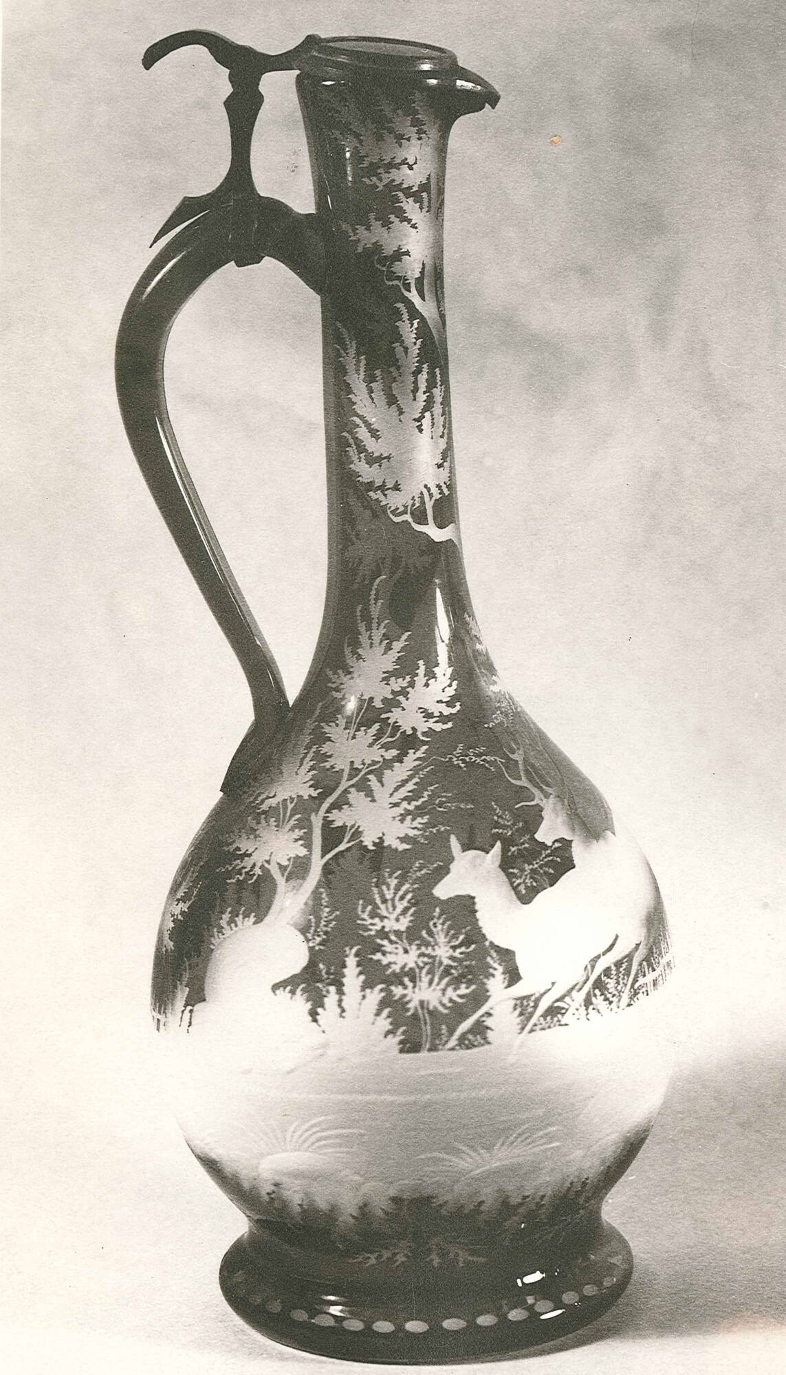 DescriptionFlahsed glass. Ruby and clear glass with elaborate engraved pattern of deer in woods. Pewter top.