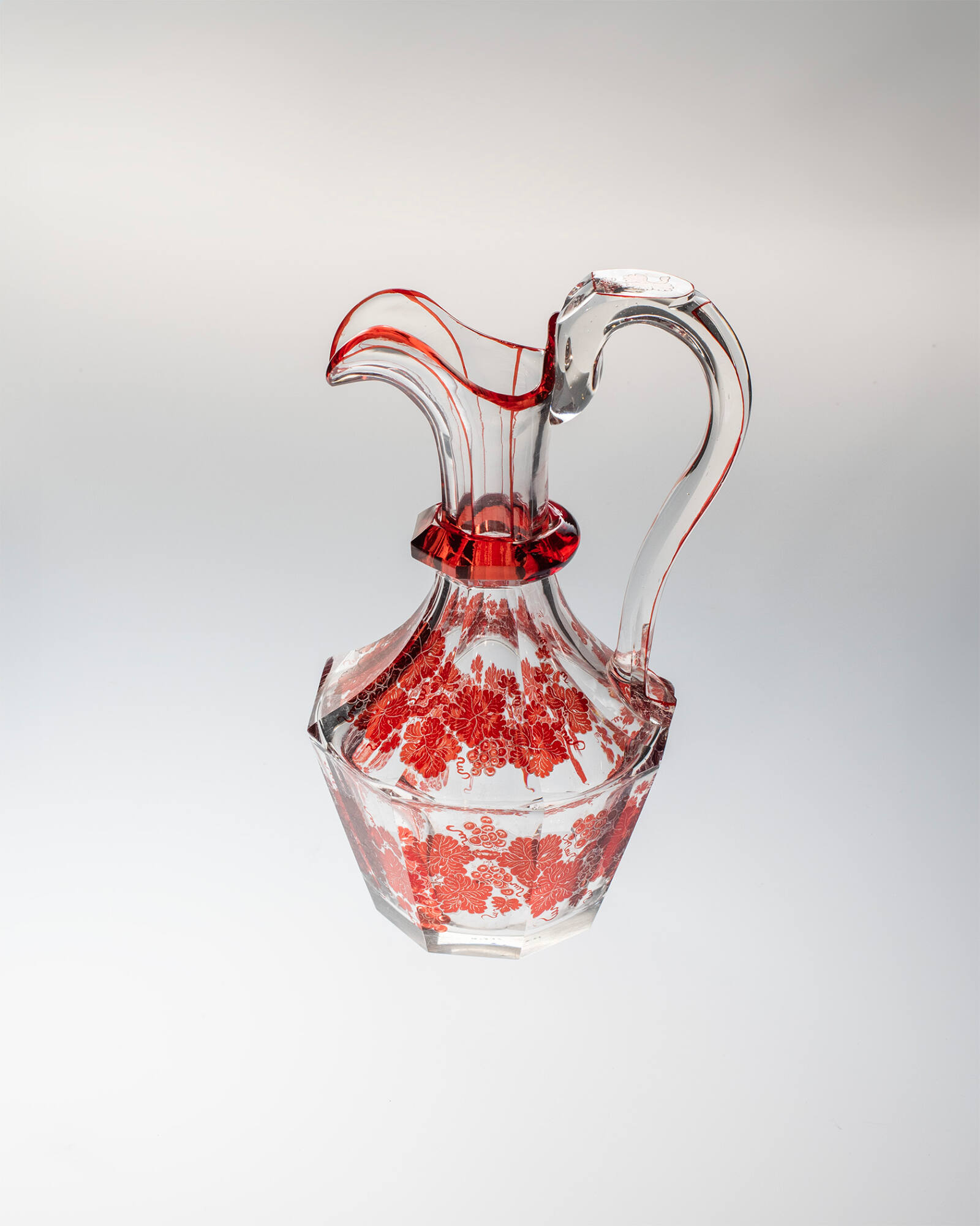 DescriptionClear glass, finished with ruby, and engraved. Grapevine pattern. Handles and stoppers.