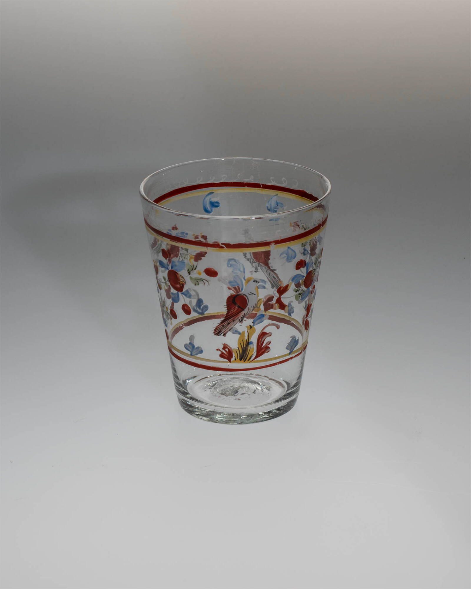 DescriptionFree-blown; enameled. Colorless; straight sides, narrowing toward base; decorated with "peasant-type" enamels in red, white, blue, yellow, green, white, and black; birds and flowers.
