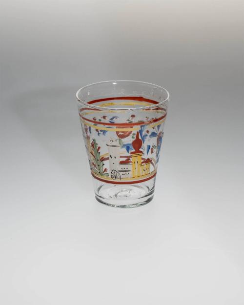 DescriptionFree-blown, enameled. Colorless; straight sides narrowing to base; decorated with "peasant-type" enamels in red, blue, green, yellow, black, and white; picture of two castles with towers and conventionalized flower design.