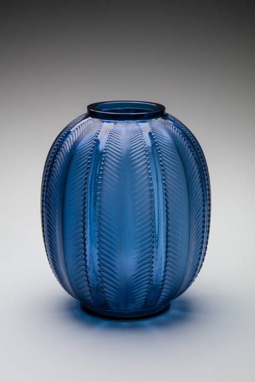 DescriptionHeavy dark blue glass vase, sculptured pattern, frosted leaf pattern, polished background.