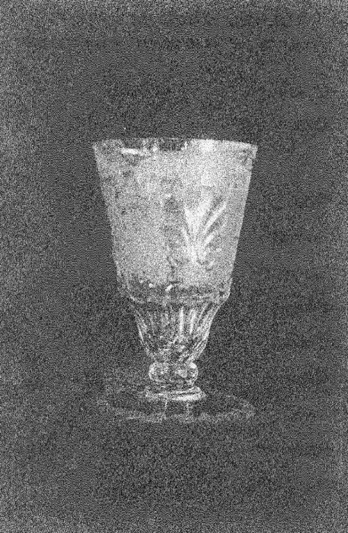 DescriptionClear glass. Shape of footed goblet. Engraved with pattern of garden scenes in three panels, surrounded by flowers.