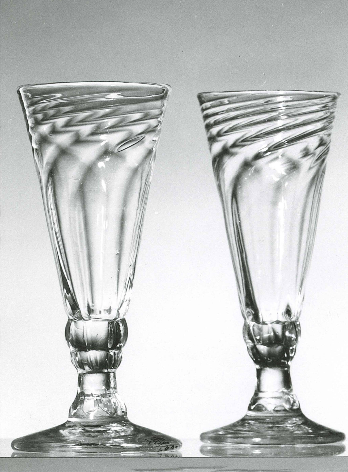 MediumBlown, molded clear lead glass, tooled into Rib and Swirl pattern, funnel shaped bowls