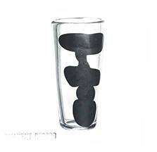 DescriptionSlightly flaring cylindrical shape of thick yellowish soda lime glass with applied abstract design in opaque black and blue glass, 1949-1950.