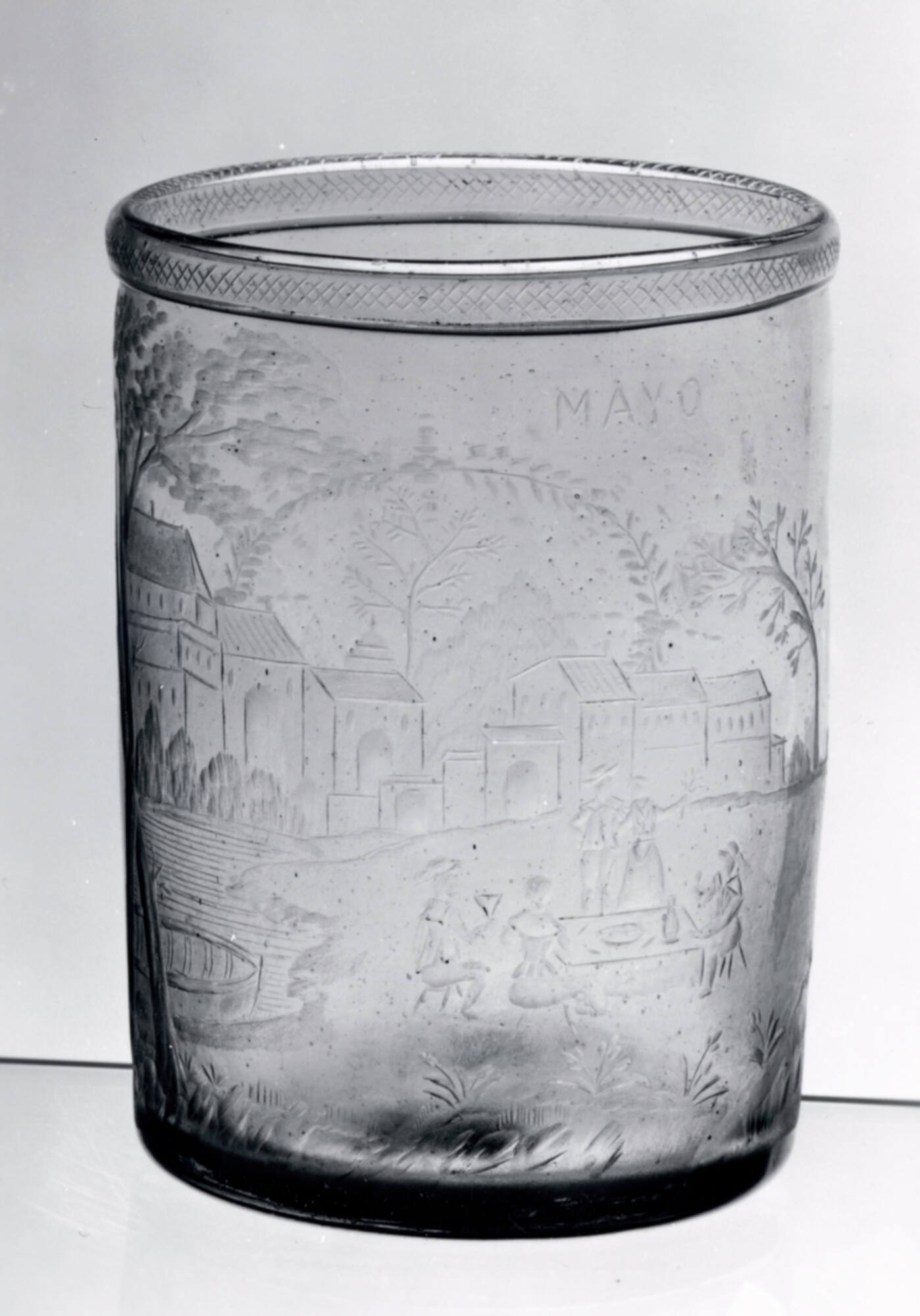 DescriptionHeavy yellow-green glass, cylindrical form, engraving of landscape, and the word MAYO
