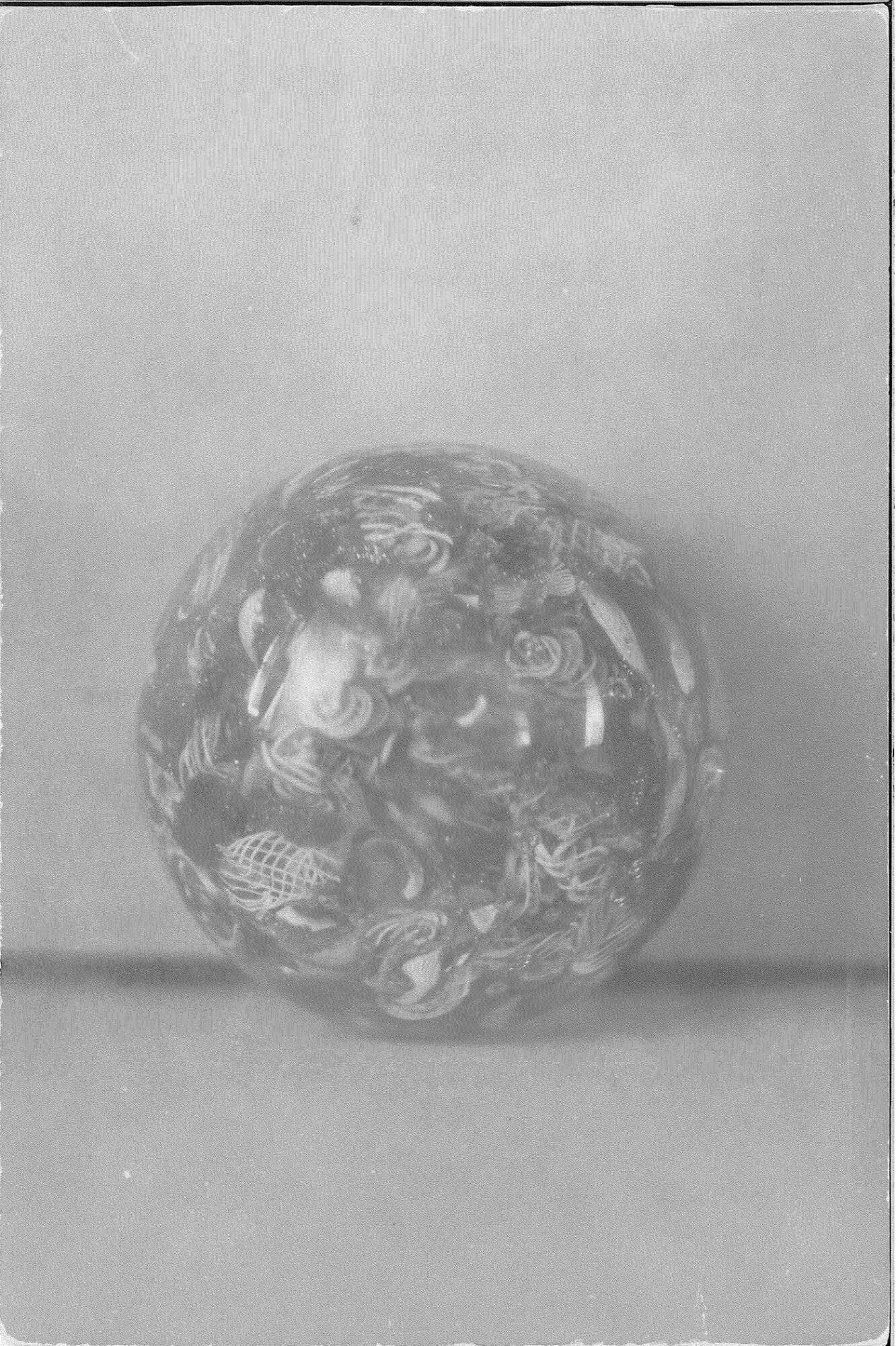 DescriptionHot-tooled. "Scrambled millefiori" paperweight; colorless near-sphere enclosing polychrome filigree and plain canes of white, white and blue, green and white, pink and white, yellow and "aventurine."