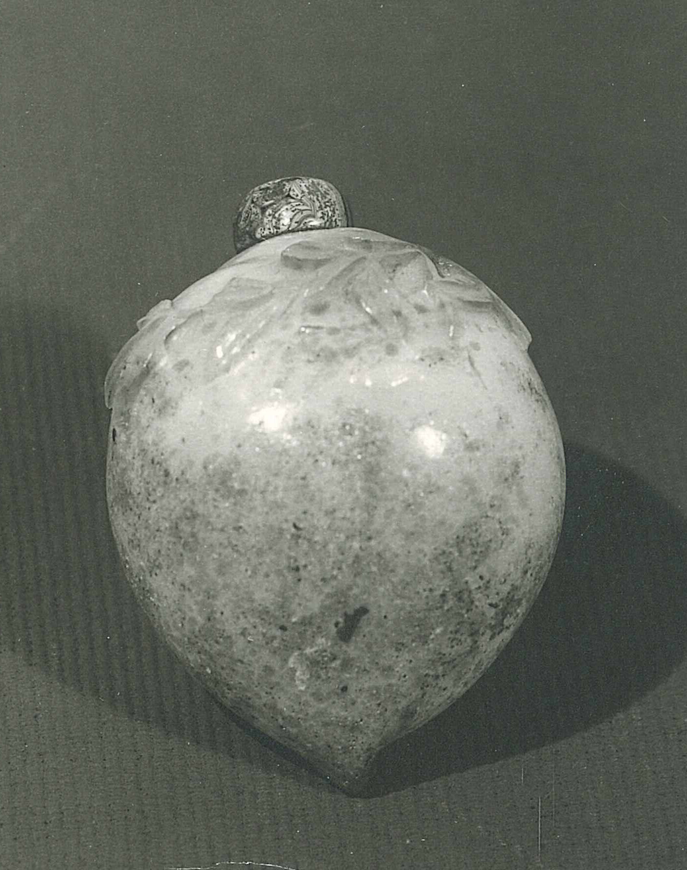 DescriptionIn the shape of a peach. Opalescent glass, white splashed with rose; green carved overlay of bat and leaf.