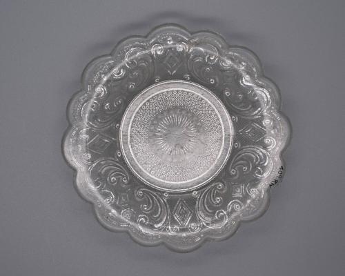 DescriptionPressed clear glass in Plum and Diamond pattern with Variant Sunburst center, scalloped edge.