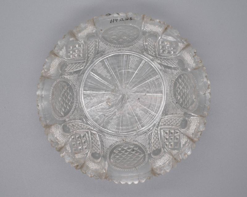 DescriptionPressed clear glass in Rayed Crossed Peacock Eye pattern, scalloped edge.