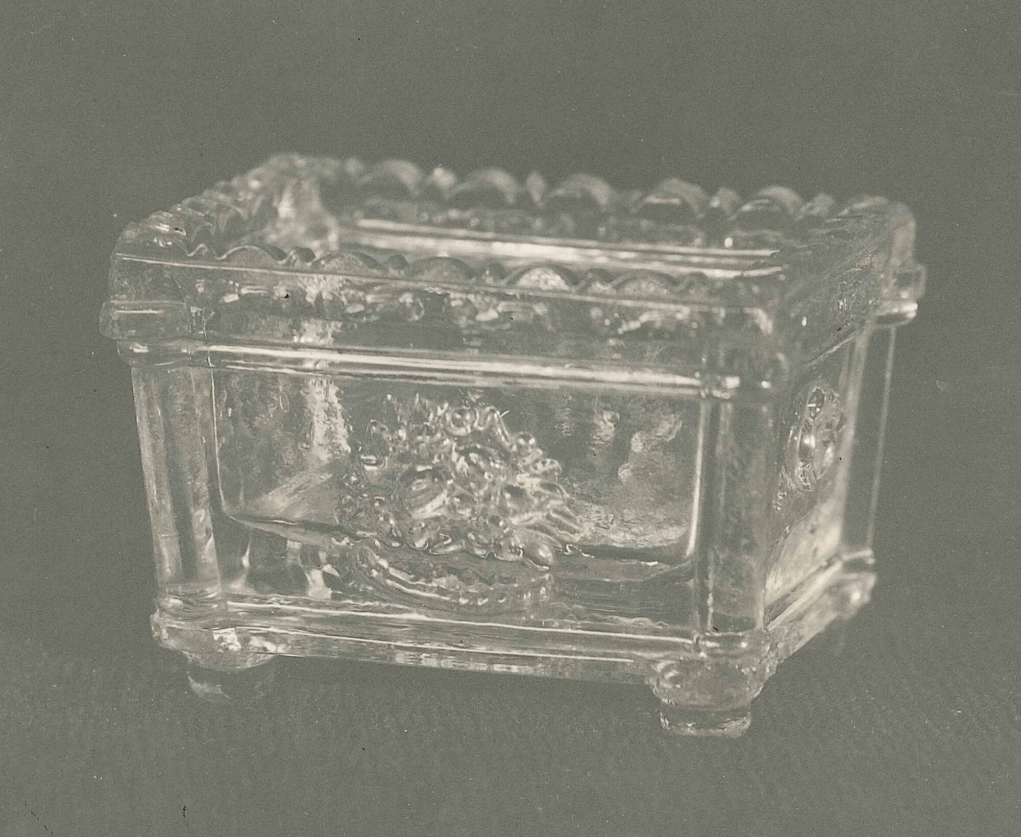 DescriptionClear glass. Rectangular form, standing on four round feet. Relief design, a rose at each end, a basket of fruit on each side.