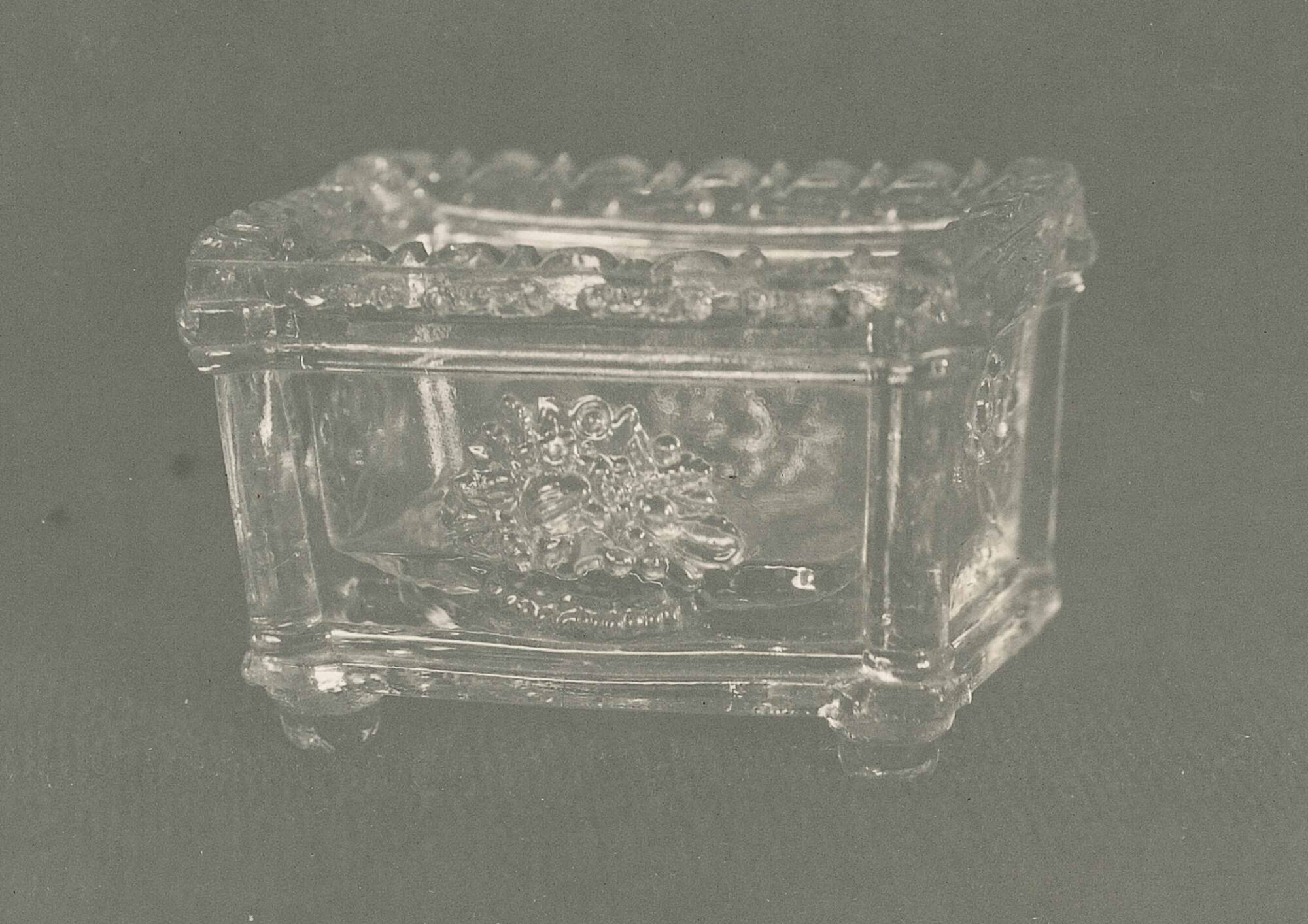 DescriptionClear glass. Rectangular form, standing on four round feet. Relief design, a rose at each end, a basket of fruit on each side.