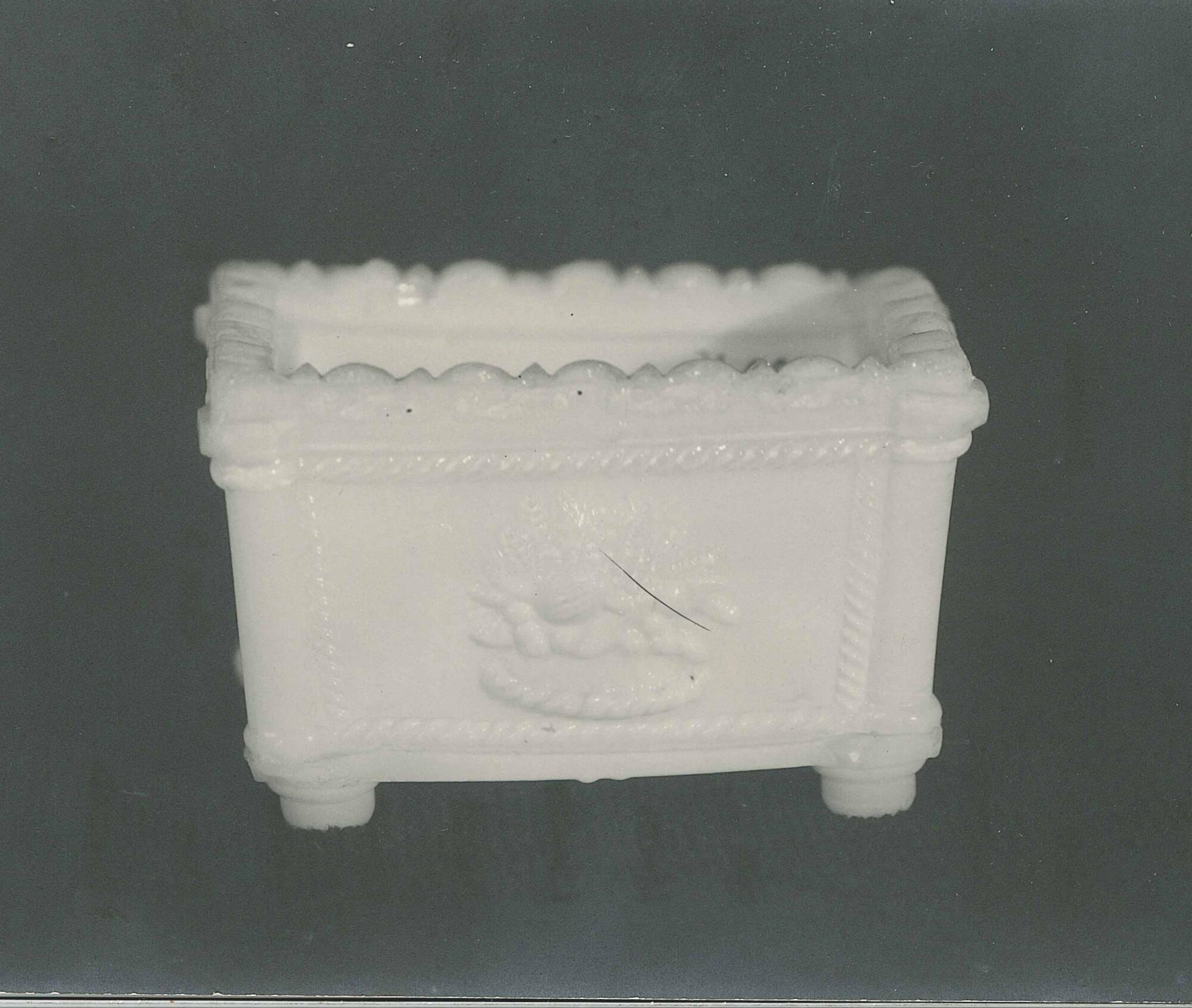 DescriptionWhite glass. Rectangular form, standing on four round feet. Relief design: a rose at each end, a basket of fruit on each side.