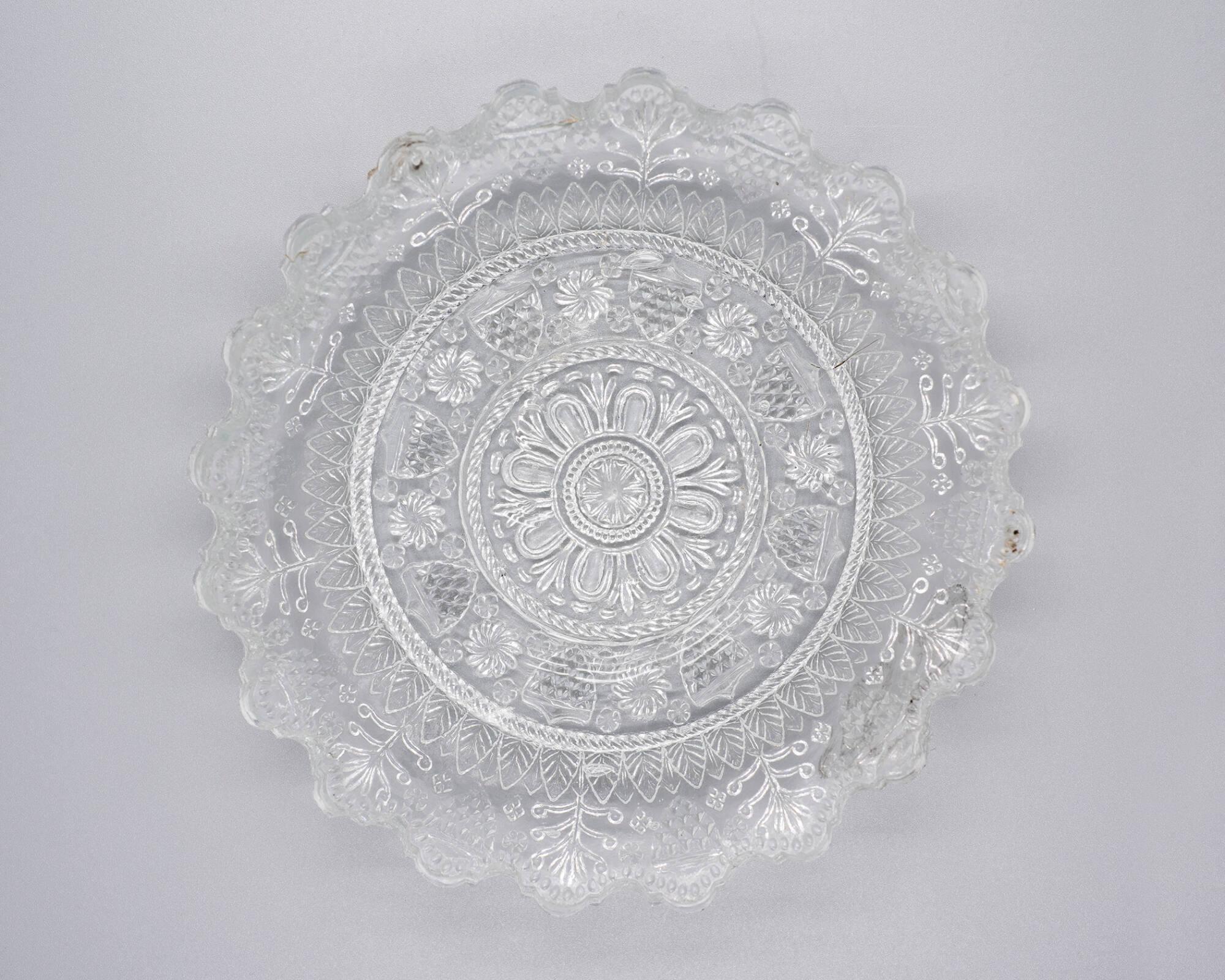 DescriptionPressed clear lead glass. Scalloped edge with shield, pine tree, and leaf motif inside rim. Shield, rosette, etc., in center medallion.
