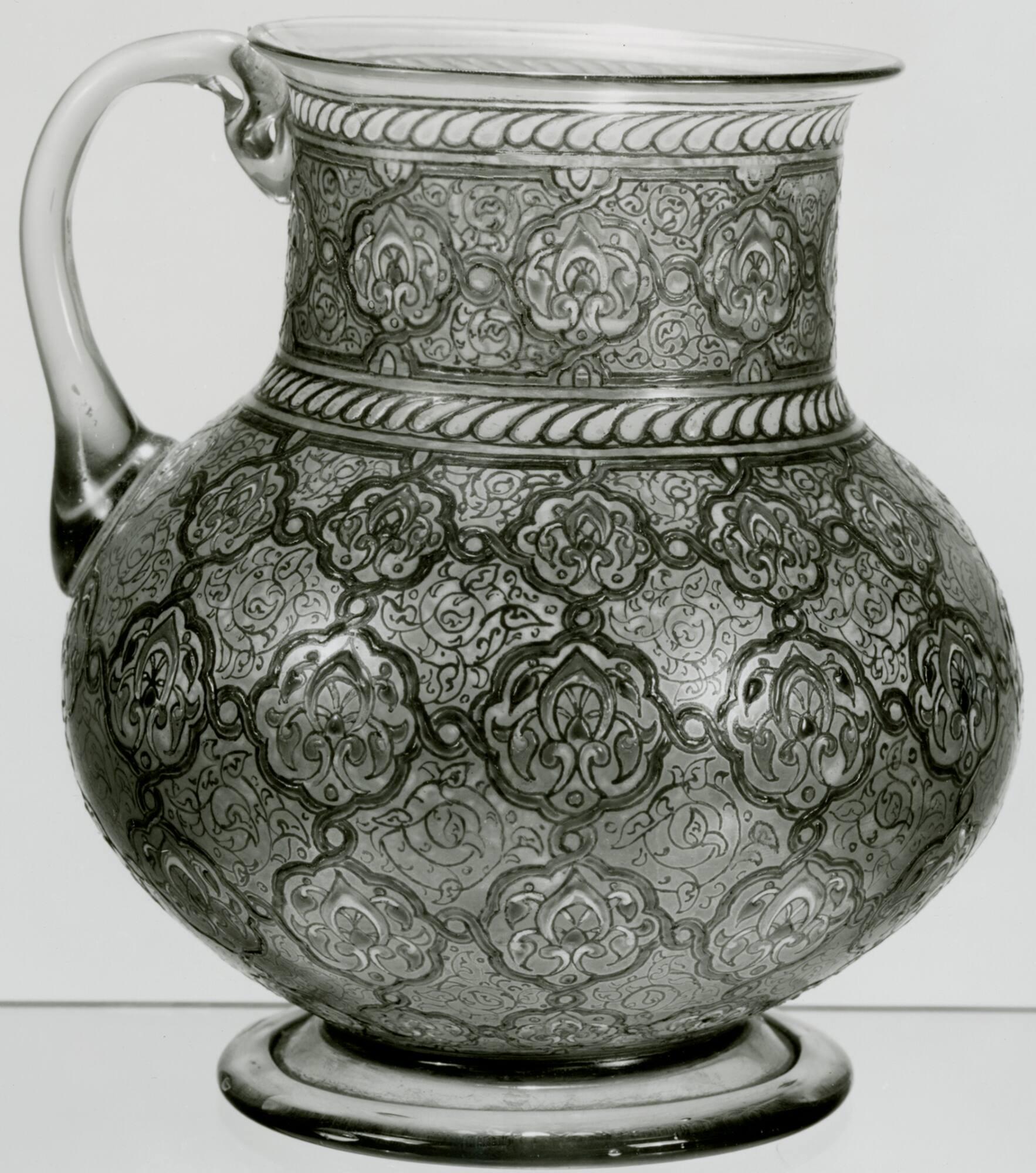 DescriptionPale amber glass with allover decoration of arabesques in colored enamel and gold. Handle undecorated.