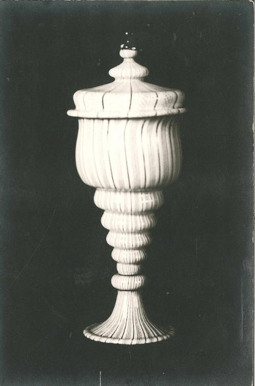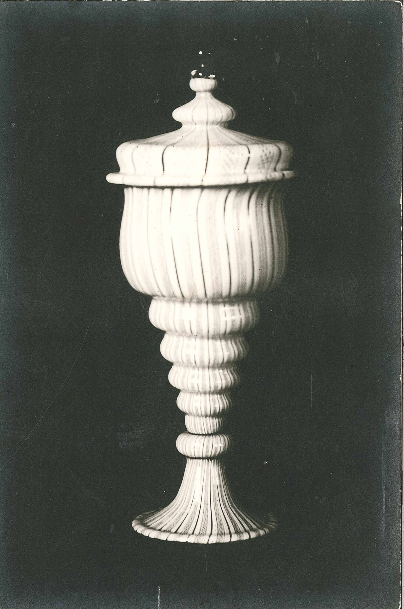 DescriptionLace glass in pattern of vertical filigree stripes. Finial of clear glass on cover.