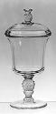 DescriptionPlantation pattern, colorless glass, pressed by a male plunger, the bowl in a one piece female mold, in conjunction with a female mold of four vertical sections to form the bottom of the bowl and stem and with another female mold of two vertical sections to form a cylinder for the fruit, with a bottom plug, or plunger, to form the foot cylinder. Foot formed from cylinder by reheating and tooling. No pontil mark. Colorless glass cover, probably pressed upside down by a plain male plunger in a combination mold made up of a one piece female mold to form the cover and a four piece mold to form the finial.