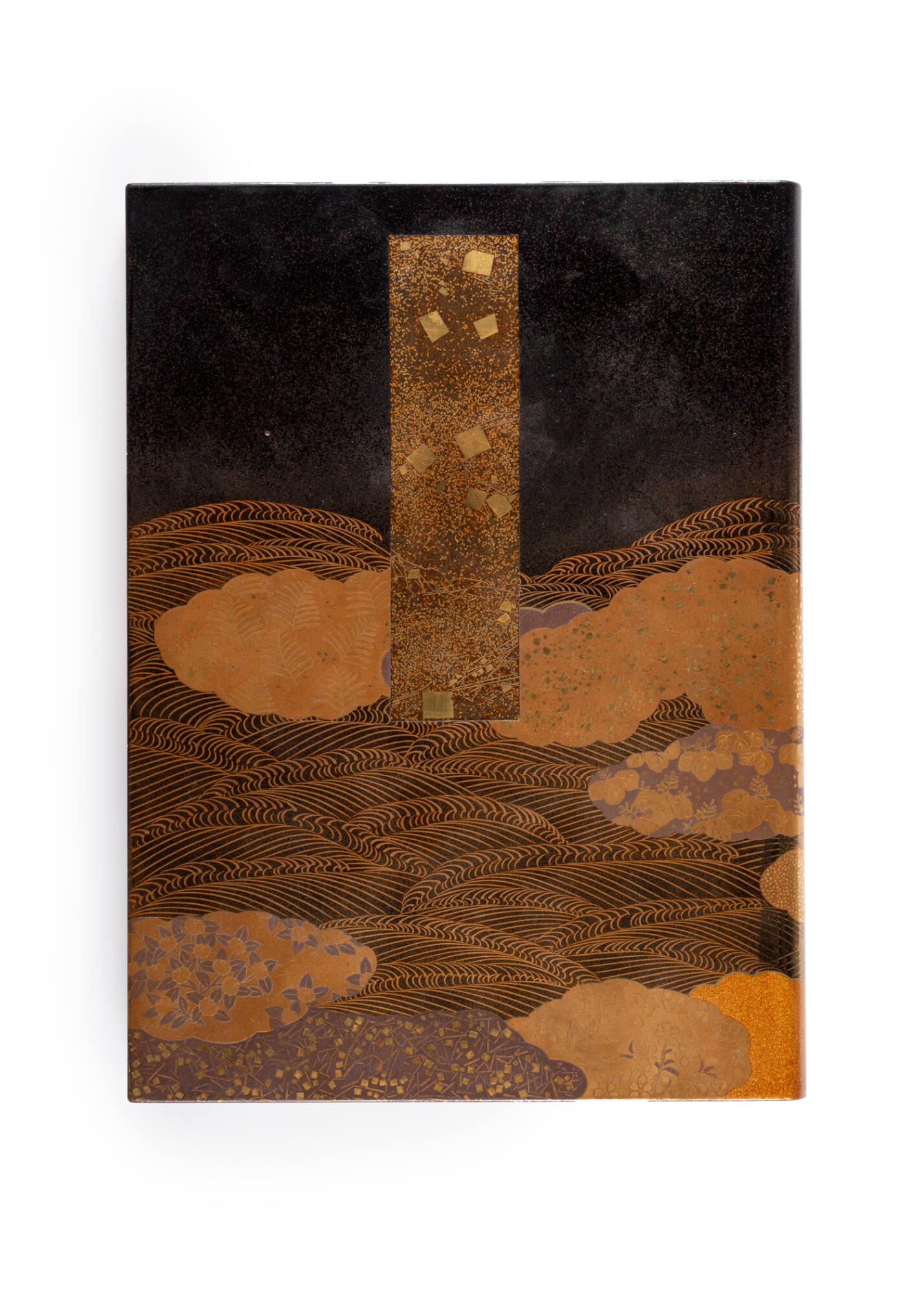 DescriptionFlat decoration including: gold filings; inlaid cut gold foil; nashiji; glossy black