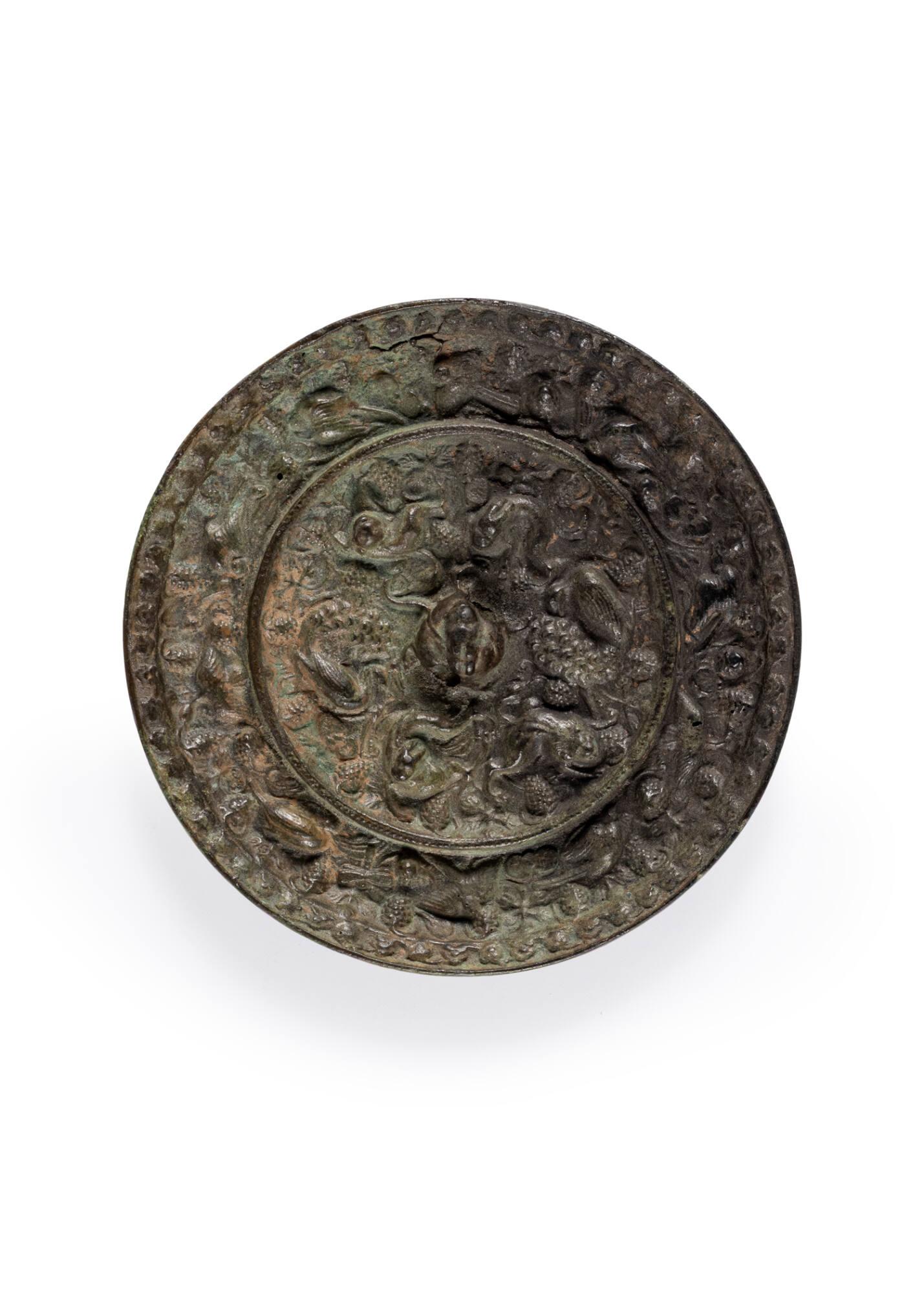 Label TextThis mirror belongs to a type known in Japanese as "Kaiju-budo-kyo" (Sea-beast Grape Mirror). This style was mass-produced during the Tang Dynasty and reflects the period's cosmopolitanism, synthesizing Chinese, Persian, Central Asian, and potentially Sogdian artistic influences. The grape motif, introduced from West Asia, symbolized prosperity, while the lion motif (common on this type) was a symbol of royal authority adopted from Persia and India. Recent scholarship has linked the emergence of this design to the introduction of Manichaeism by Sogdian traders along the Silk Road in the late 7th century.Tang Dynasty (618-907)