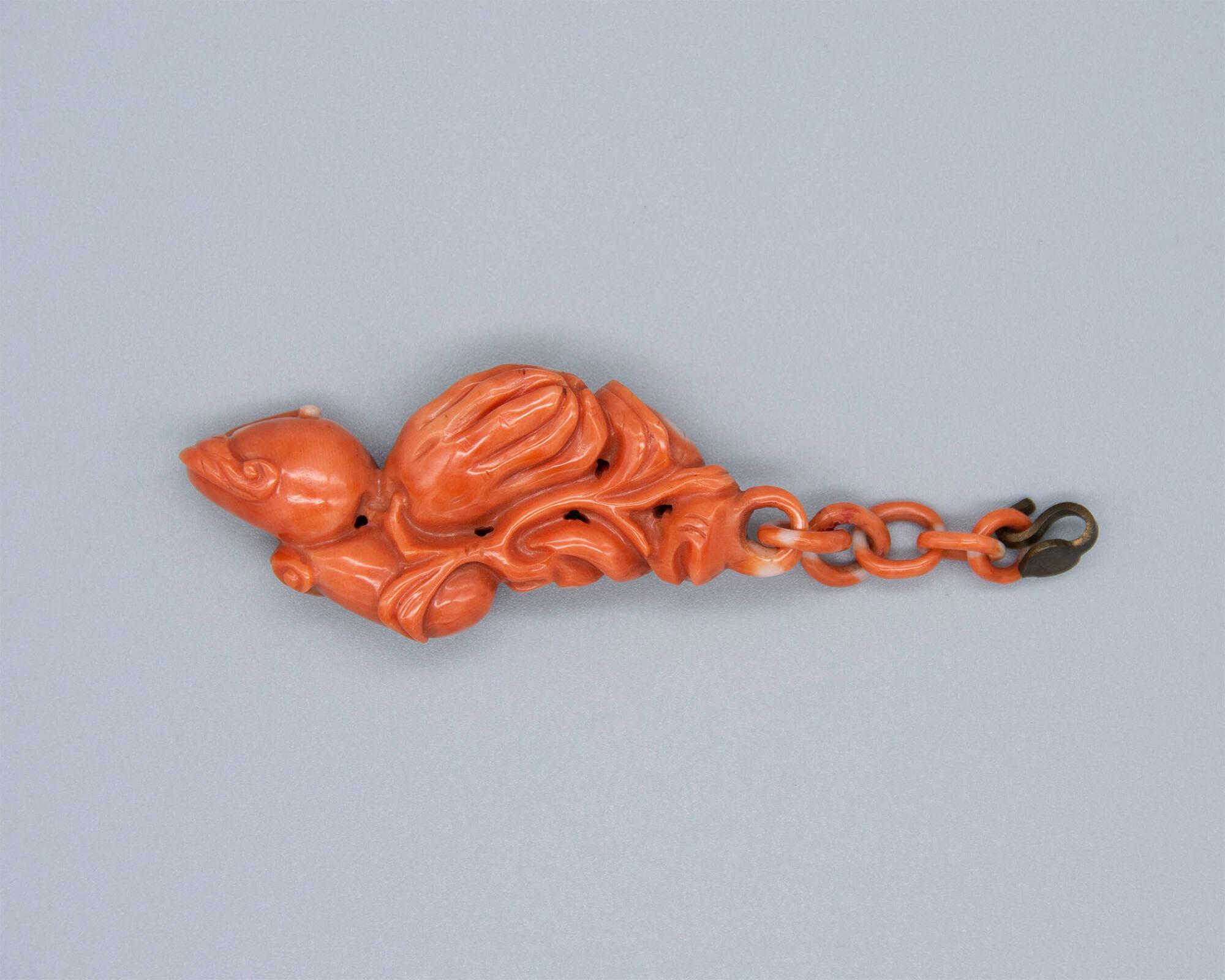 DescriptionCarved to represent the citron, peach, and bat. One piece of carved coral in a wood frame.