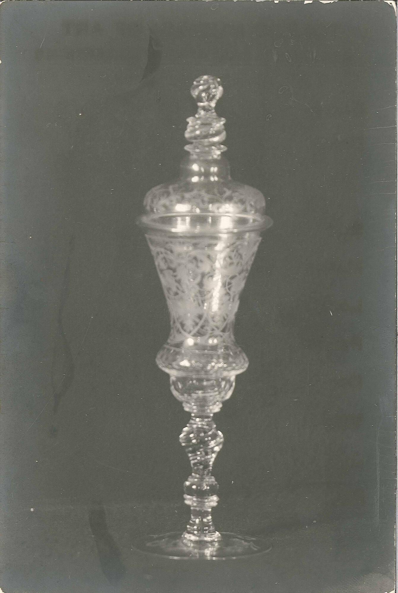 DescriptionTall, goblet shaped. Fine glass with engraved scroll and floral pattern. Ruby and gold flashing in stem and finial.