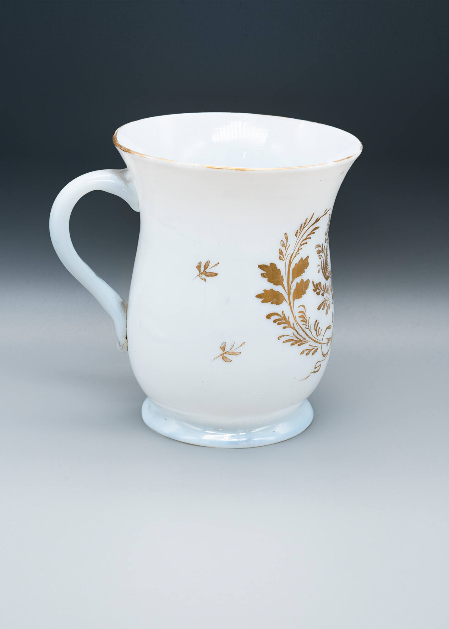DescriptionWhite glass with floral design painted on front in gold. Handle.