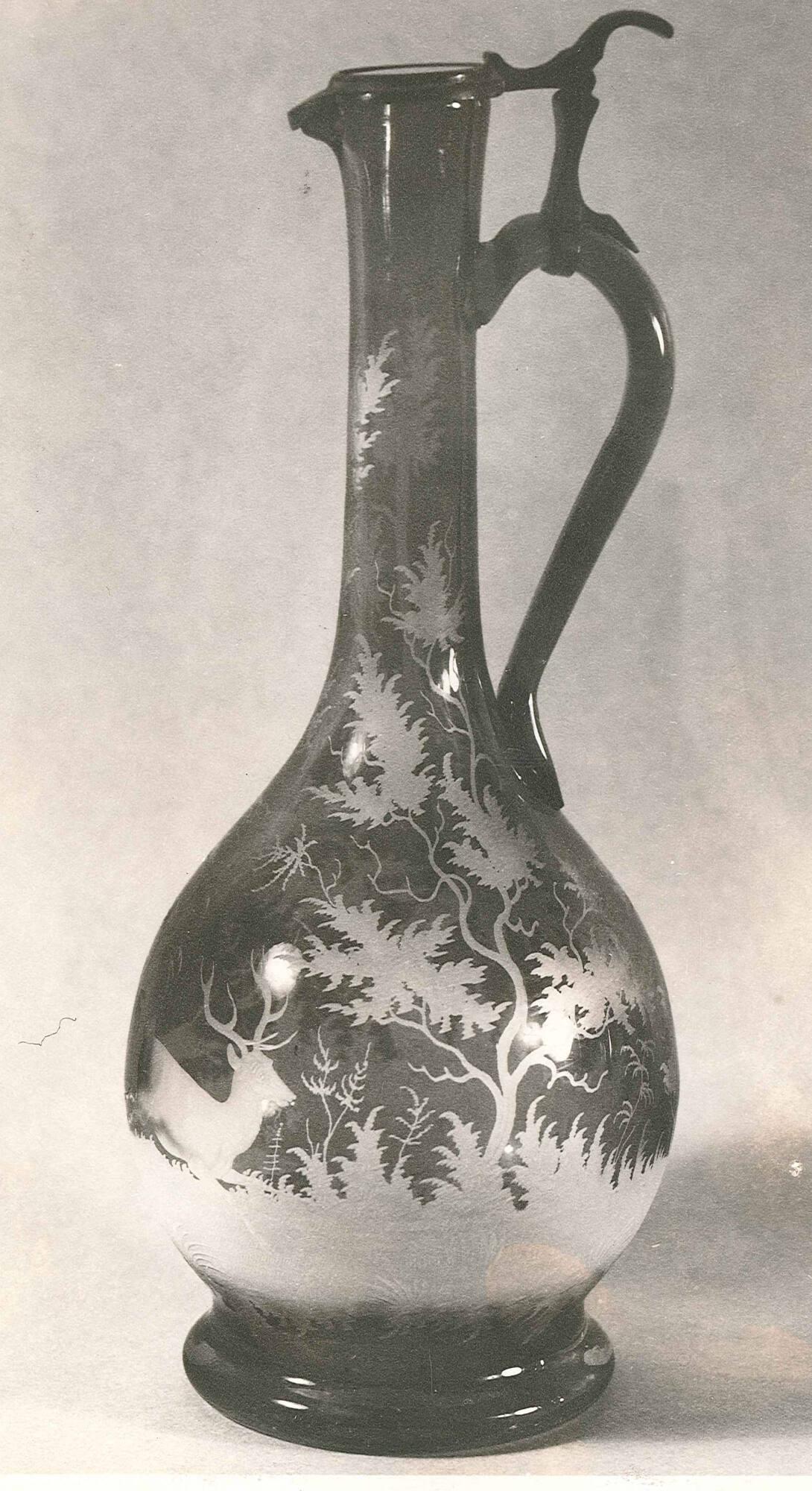 DescriptionRuby and clear glass with elaborate engraved pattern of deer in woods. Pewter lid.