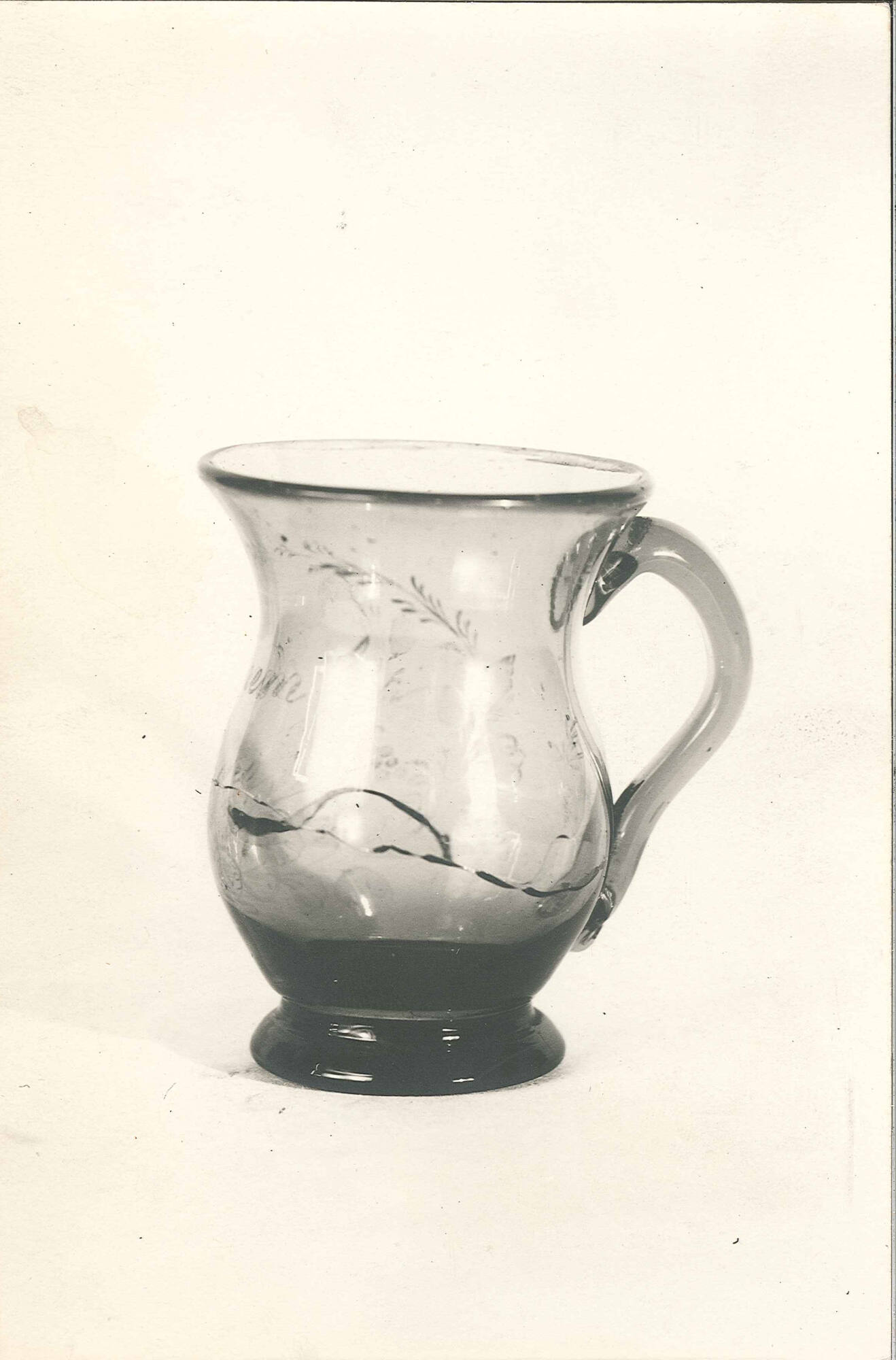DescriptionSapphire blue glass with gold wreath enclosing the inscription.