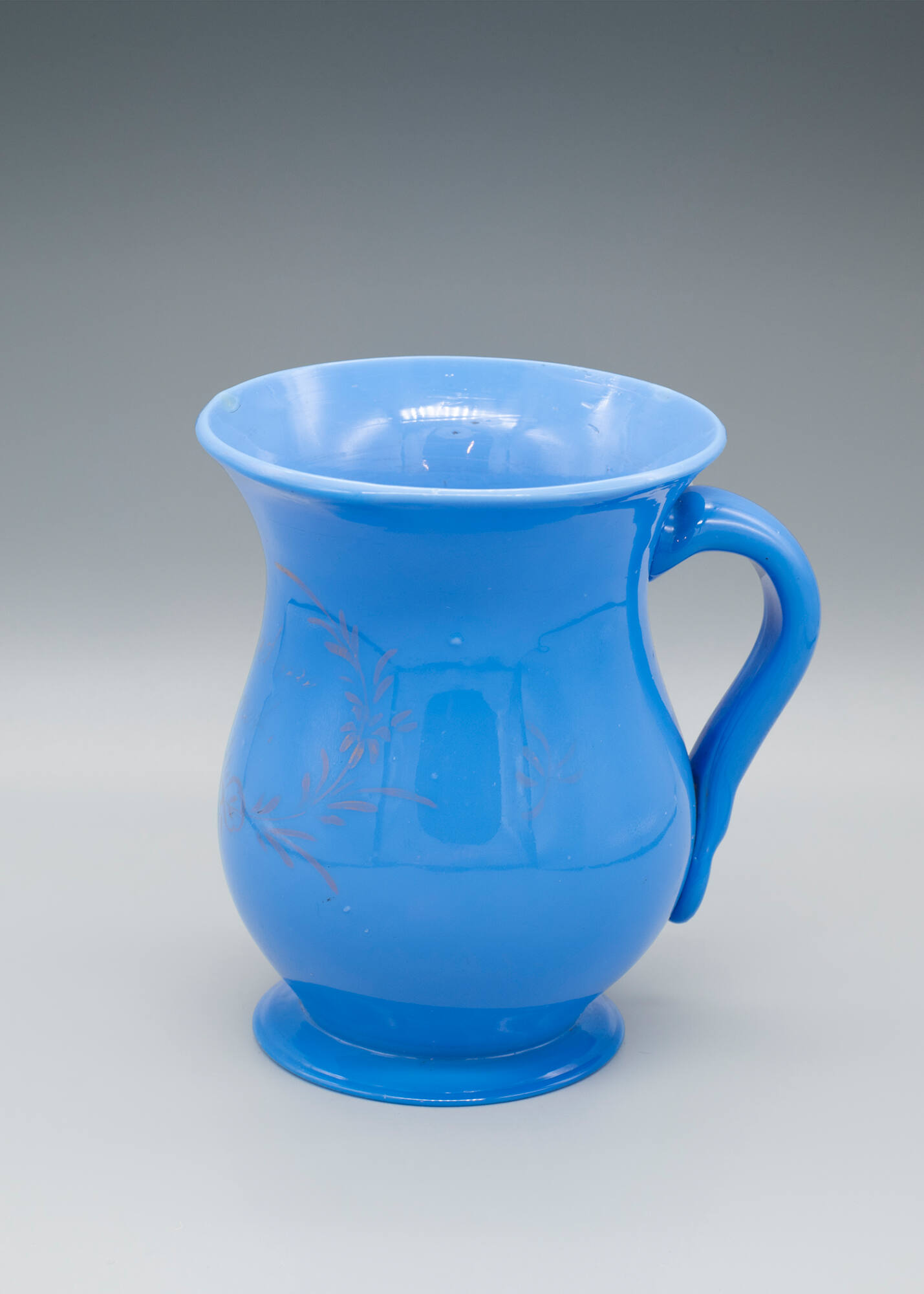 DescriptionOpaque light blue glass, with gold wreath enclosing the inscription.