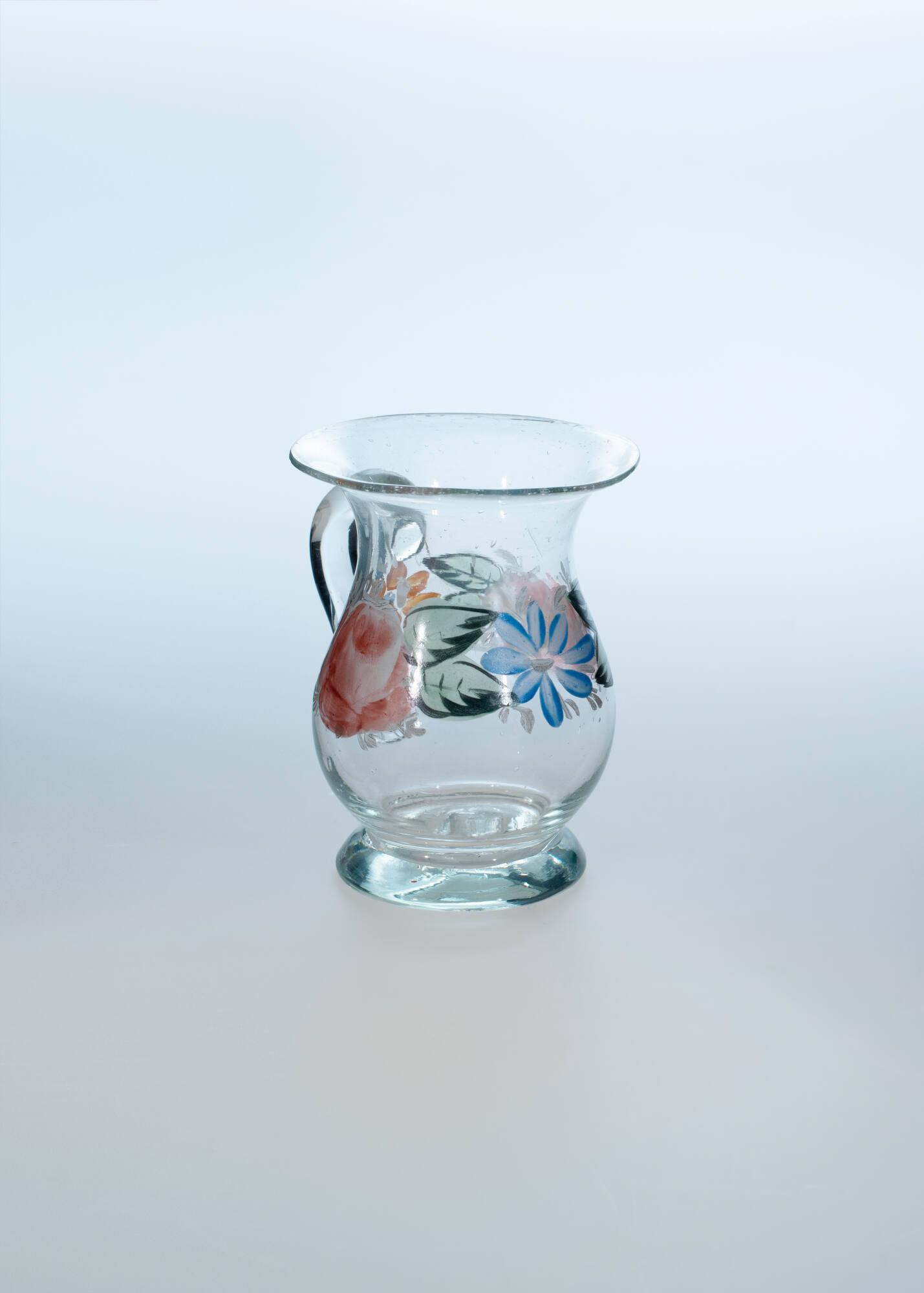 DescriptionClear glass, bell shape, decorated with band of flowers in natural colors. White painted lining on inside.