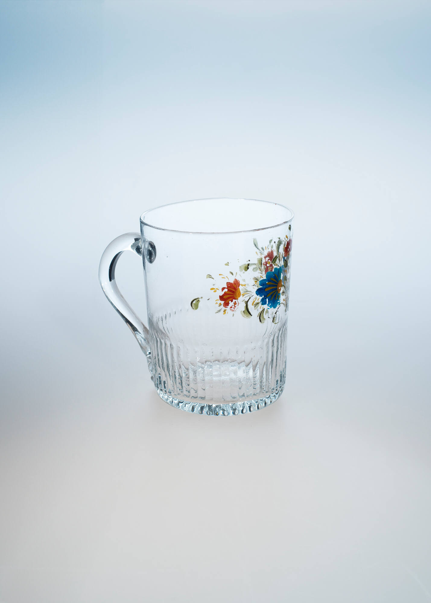 DescriptionClear glass. Lower half fluted. Superficial painting of flowers in color. No inscription.
