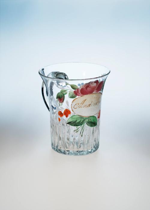 DescriptionClear glass, flaring rim and fluted lower half. Decorated with irregular medallion containing the word "Andenken" in brown. Coating of white paint on inside.