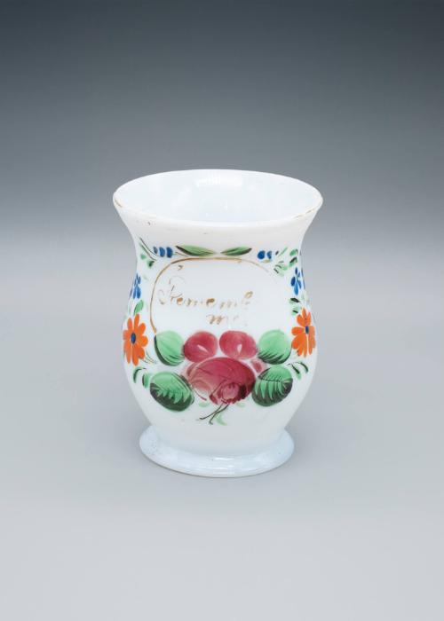 DescriptionMilk white glass. Decorated with floral wreath in colors with inscription in gold.