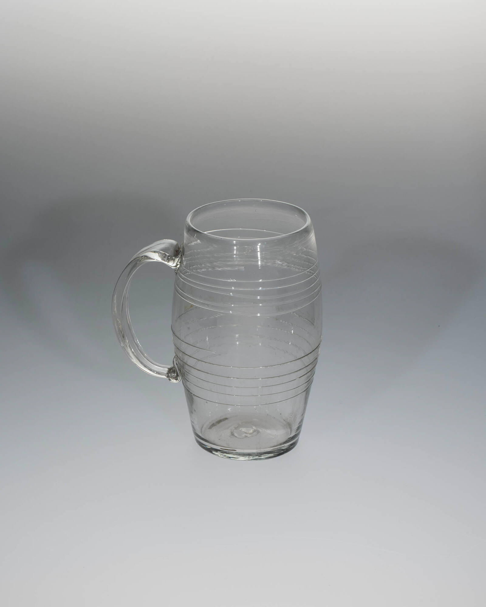 DescriptionClear glass with thin glass thread applied around barrel shaped body.