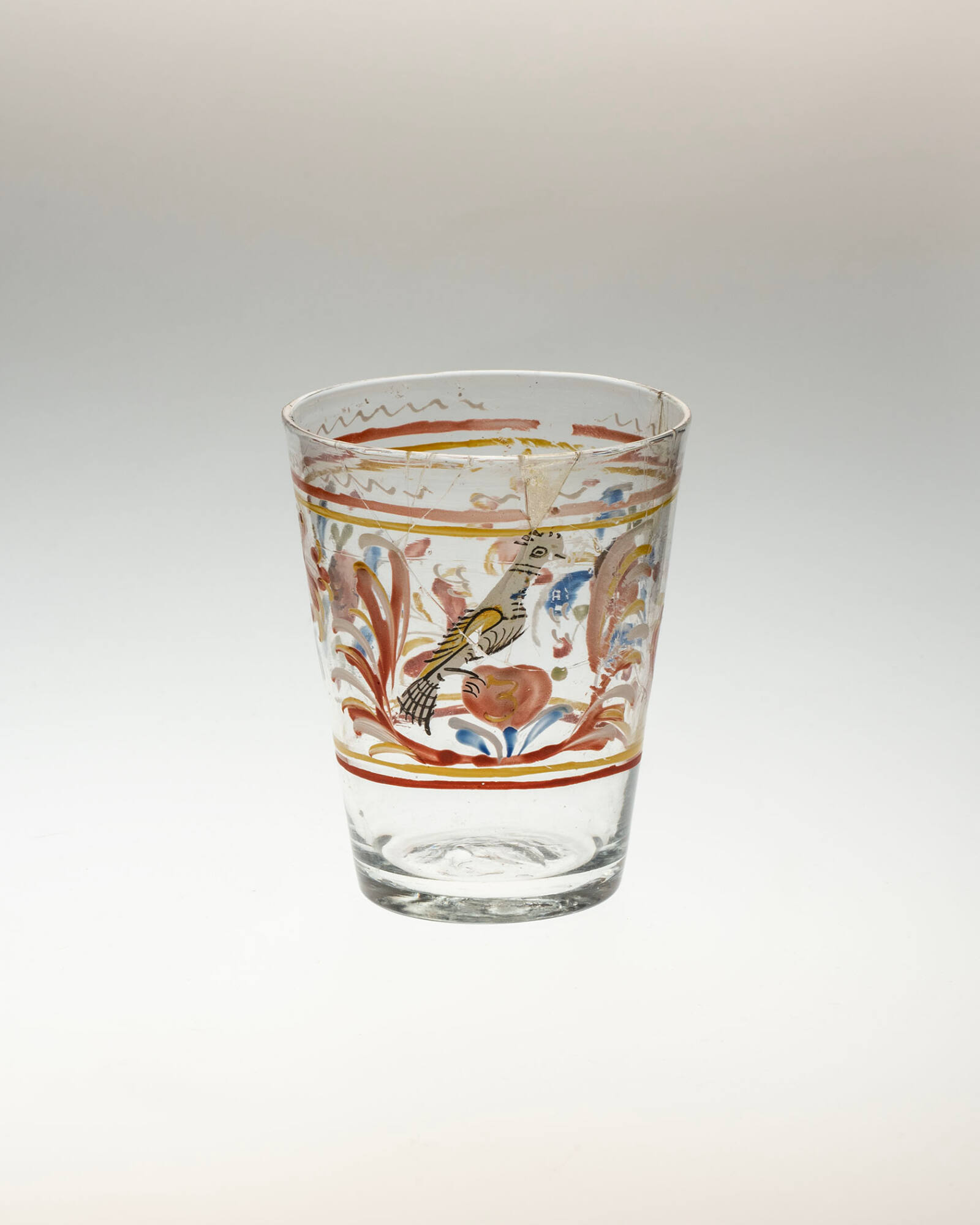 DescriptionBird standing on heart, dove pattern. Painted in enamel colors on clear white glass.