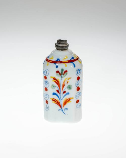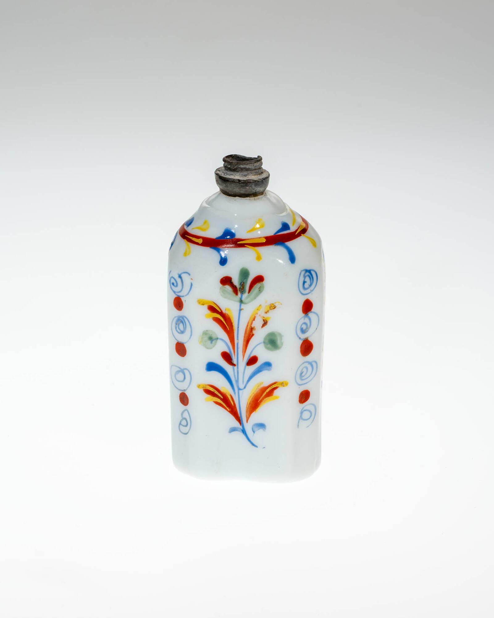 DescriptionRectangular form, milky white glass, painted with floral sprays in enamel colors.