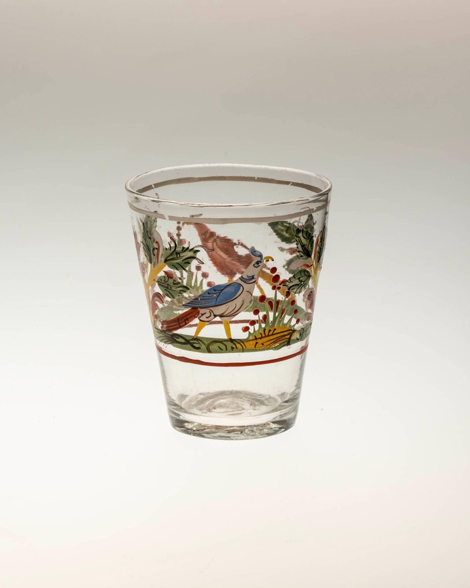 DescriptionDecorated with birds and flowers in bright enamel colors on clear glass.