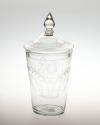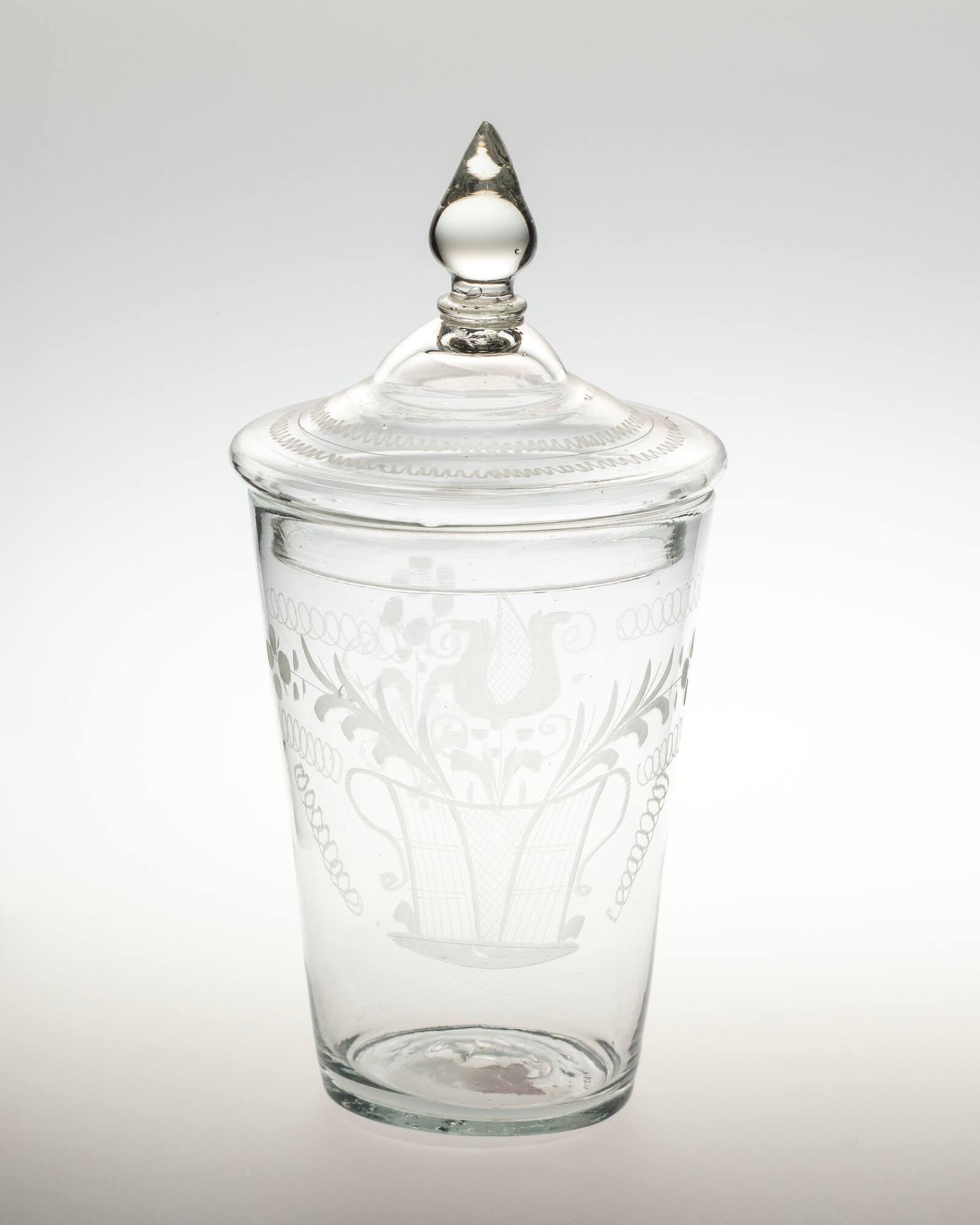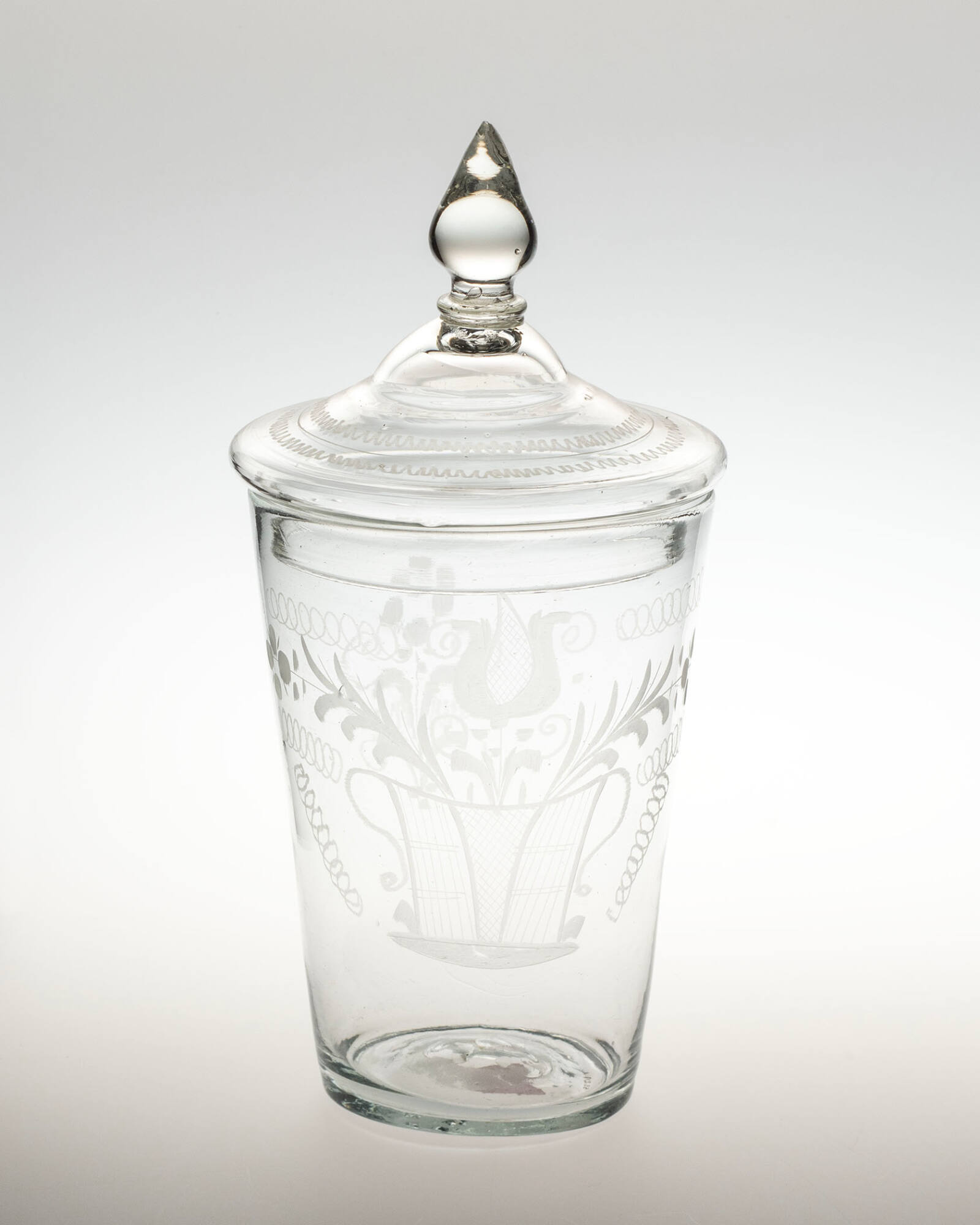 DescriptionClear glass, engraved with tulip and other floral sprays in urn. Cover has solid pointed finiah. Stiegel-type.