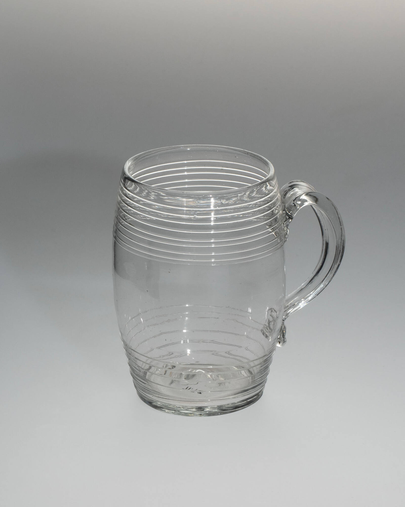 DescriptionBlown barrel-shaped mug with applied strap handle and two applied threaded bands.