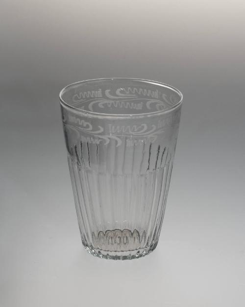 DescriptionBlown soda-lime glass with vertical ribbing and etched border.
