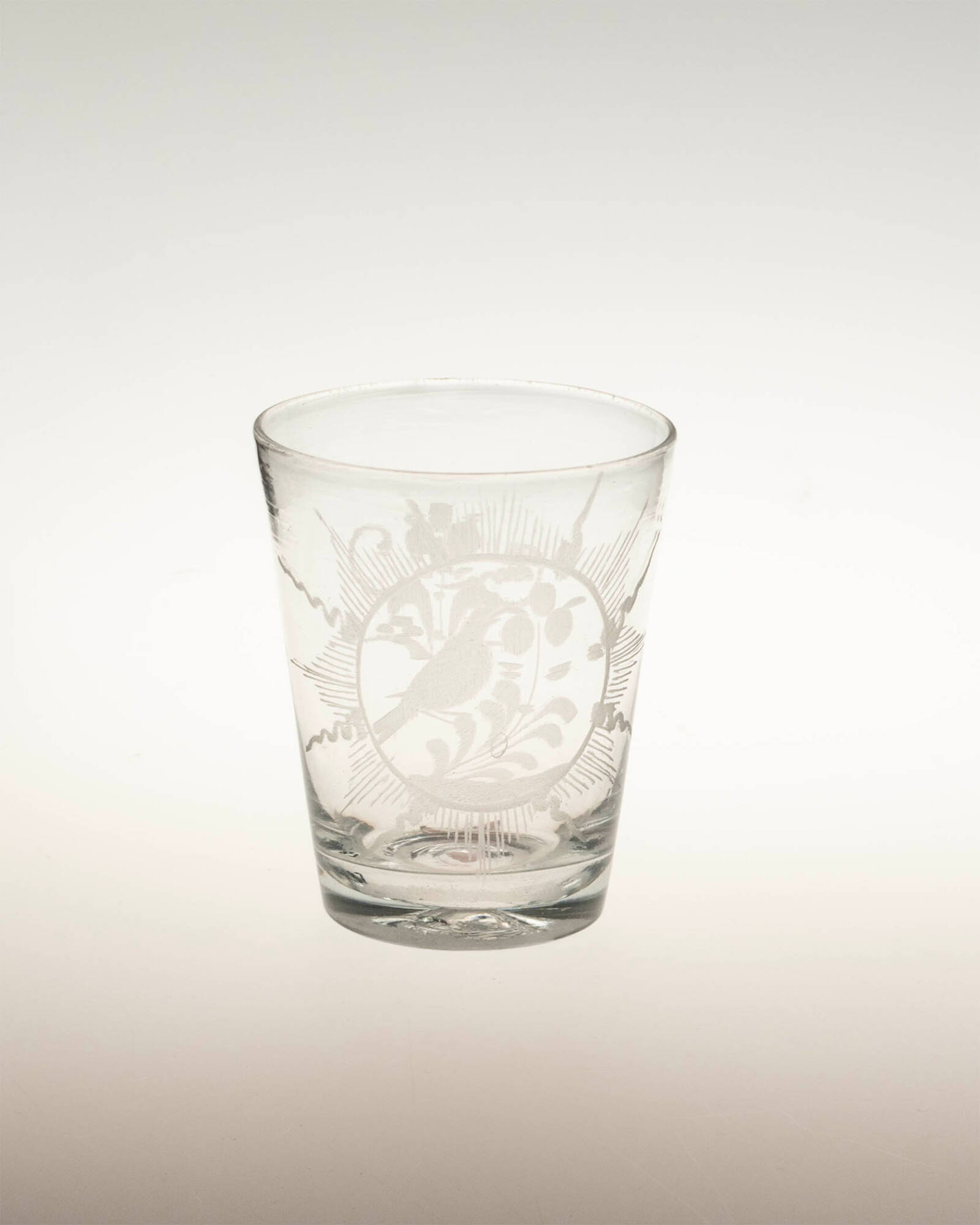 DescriptionBlown with etched medallion of bird and flower in sunburst.