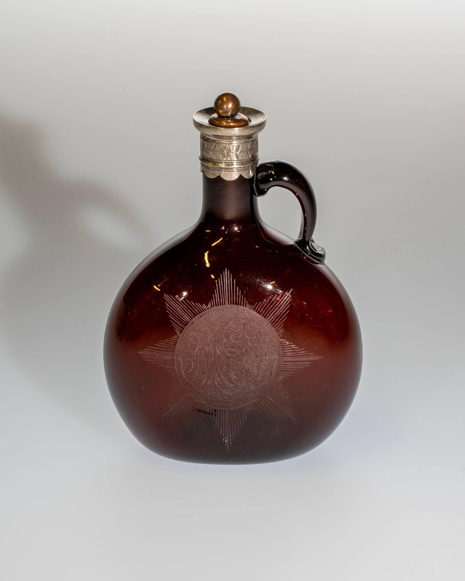 DescriptionSmall decanter of dark amber glass with handle and silver mounted top. Embossed silver label. Engraved monogram in circle.