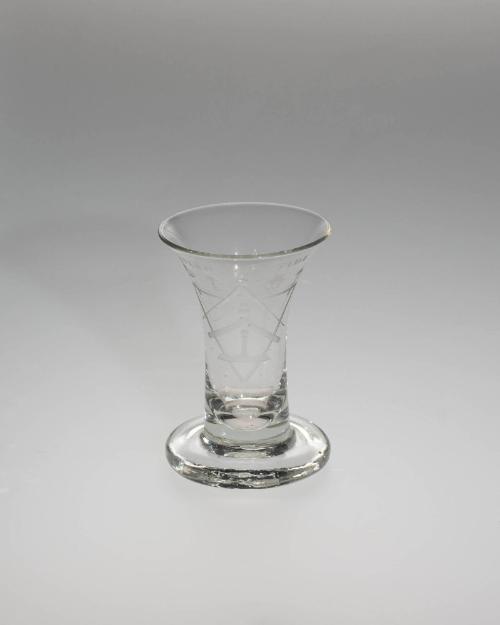 DescriptionCut glass. Funnel shaped with broad cushion foot. Masonic cut design and motto on front.