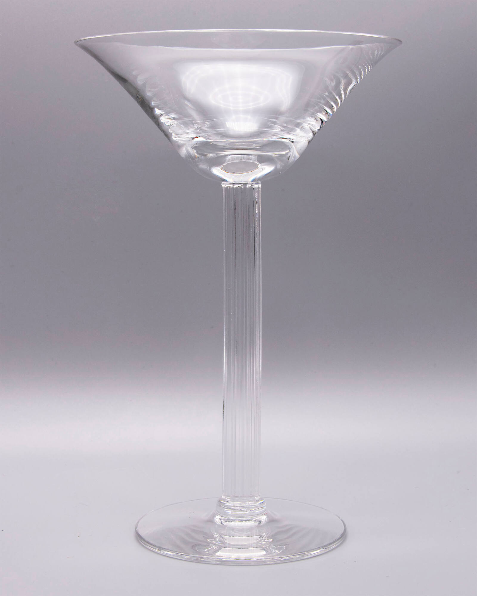 DescriptionThe Monticello - 5700 Line, Modern American Glassware. Colorless glass, bowl blown, probably in a paste mold, attached directly to a reeded stem of circular cross section, pressed in a mold, probably of two vertical sections, attached to an applied, tooled foot. No pontil mark, slight shear mark evident. Bowl probably cracked off and finished by fire polishing or grinding.